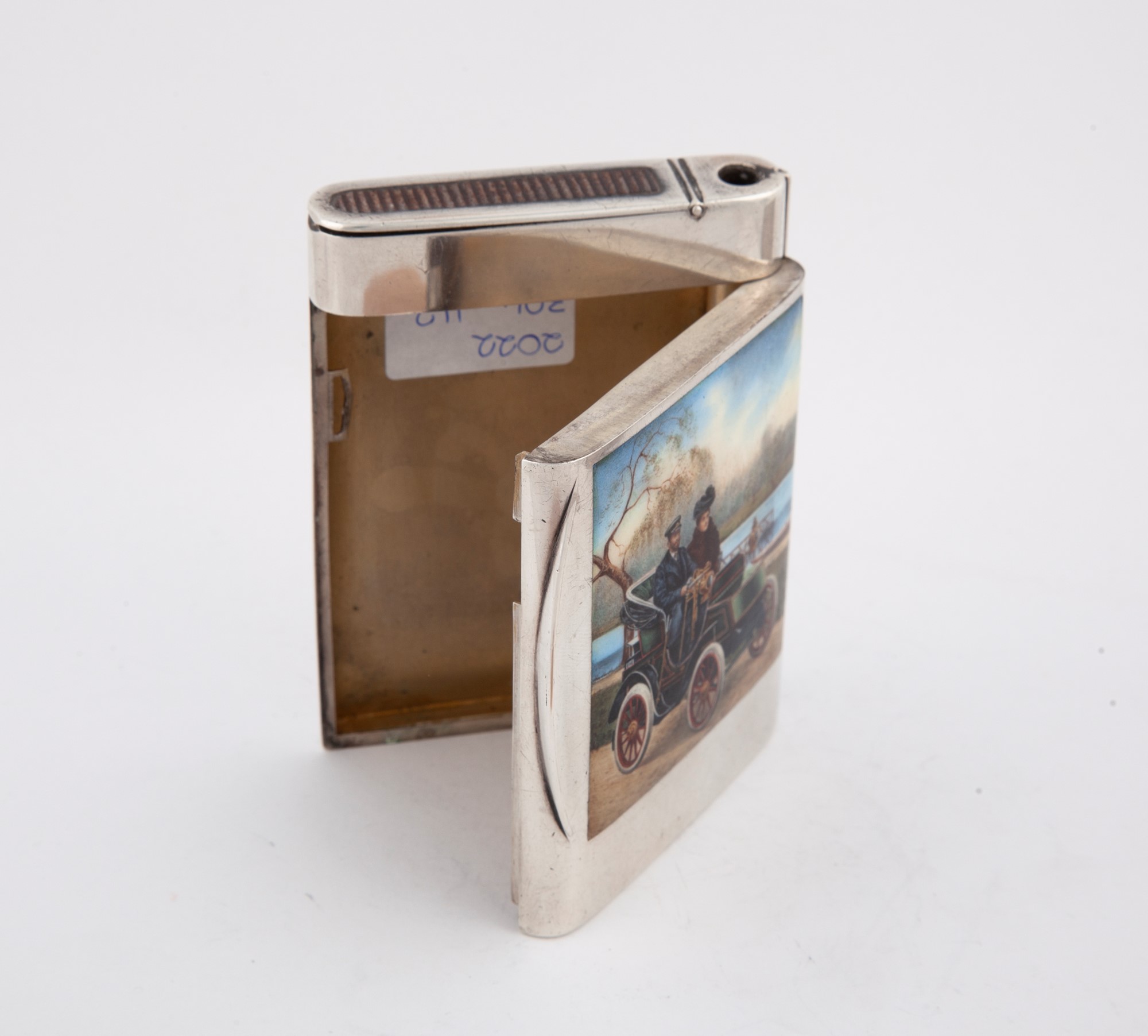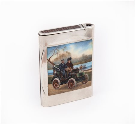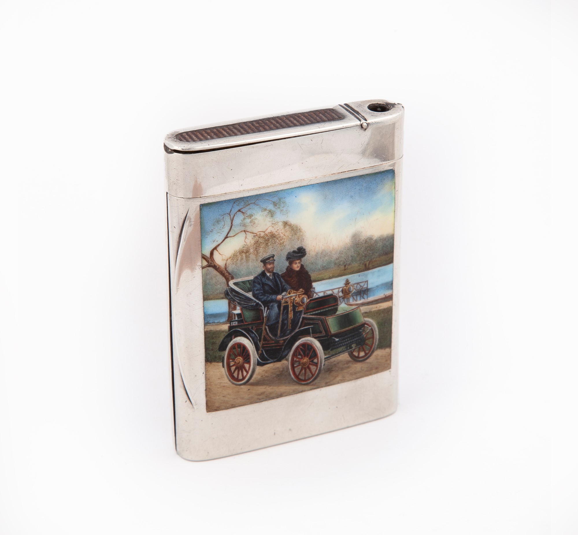 Portasigarette in argento (?) con portafiammiferi, fine del XIX/inizi del XX secolo caratterizzato da miniatura in smalti policromi raffigurante una signora in phaeton biposto con autista; sul lato superiore porzione zigrinata per l'accensione dei fiammiferi posti all'interno. Si veda per confronto l'automobile costruita da René Panhard ed Emile Levassor vincitrice nel 1896 della gara Parigi-Marsiglia-Parigi, cm 9,3x7x1,2 - gr. 180