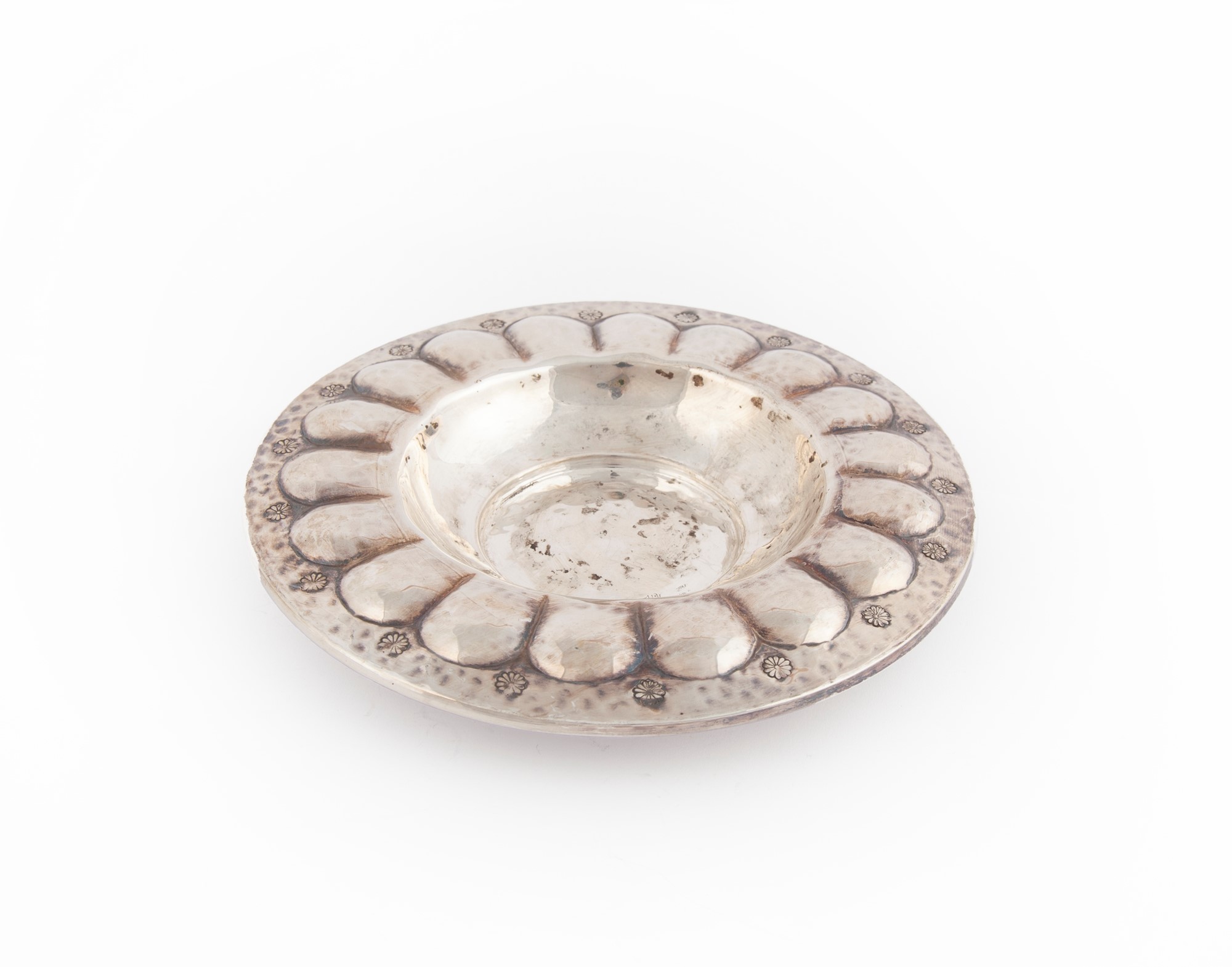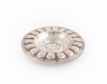 Piattino in argento, Renato Raddi con ampia tesa percorsa da baccelli impreziosita da piccole corolle incise, cm 15 - gr. 106