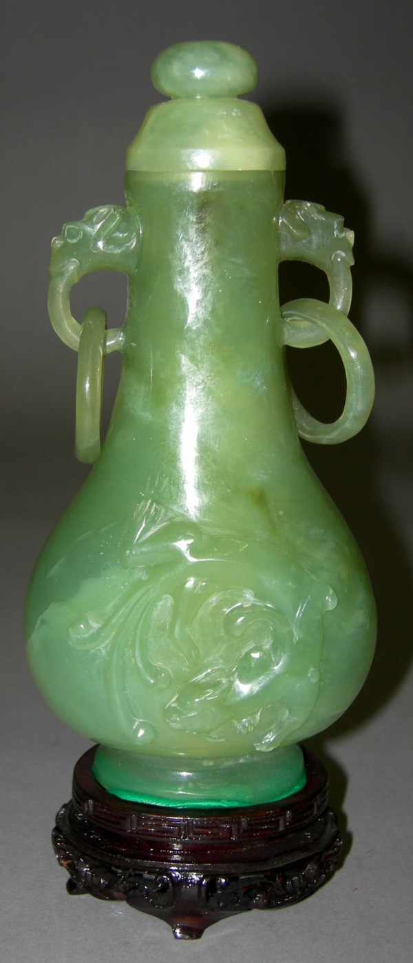 Firmato. Bottiglia in giada lavorata, montata su base di legno. XX secolo. Mis. Alt. cm. 20 ca.