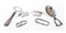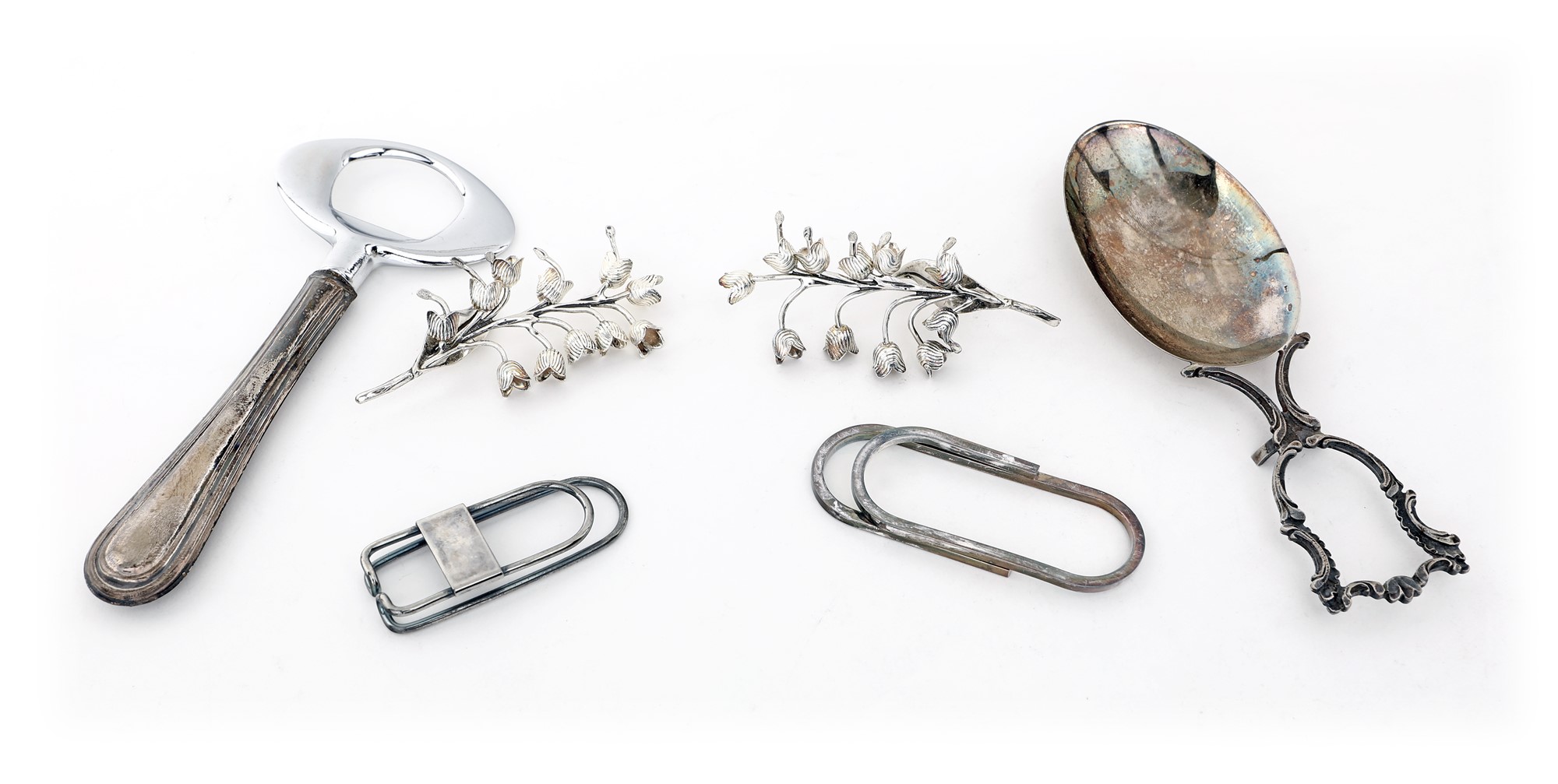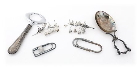 Lotto composto da sei oggetti diversi in argento due fermasoldi a forma di attache rispettivamente stondata e squadrata, un caddy spoon e due rametti di mughetto con fiori tremblant, apribottiglia in argento e acciaio (cm 13x5,5), , peso complessivo gr. 66