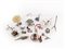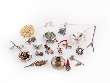 Lotto composto da vari piccoli oggetti e frammenti in argento quattro fiori recisi diversi, una spiga, una saliera a forma di fiore, una tartaruga, una scatola sormontata da uno gnomo in smalto (rotto), una foca con corpo a uovo in pietra dura, due paperelle, una farfalla, un grappolo d'uva, tre frammenti natalizi ed un sostegno a tre piedi, peso complessivo gr. 240 (in difetto)