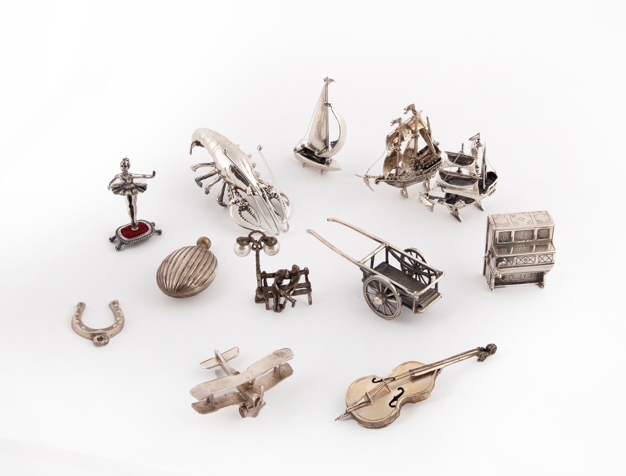 Lotto composto da dodici miniature in argento a diverso titolo ferro di cavallo, astice, carretto, flacone portaprofumo, tre barche a vela, un aeroplano, una viola, un organetto, una ballerina e due figure su una panchina con lampione con perle, peso complessivo gr. 410