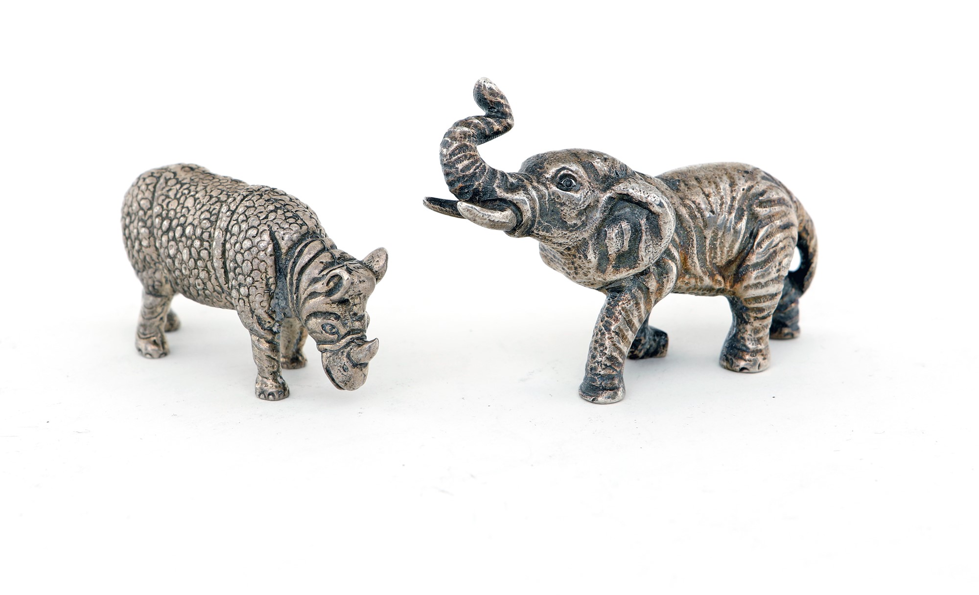 Rinoceronte ed elefante in argento , cm 2,5x5x1,5 e cm 4x6x2 - peso complessivo gr. 188