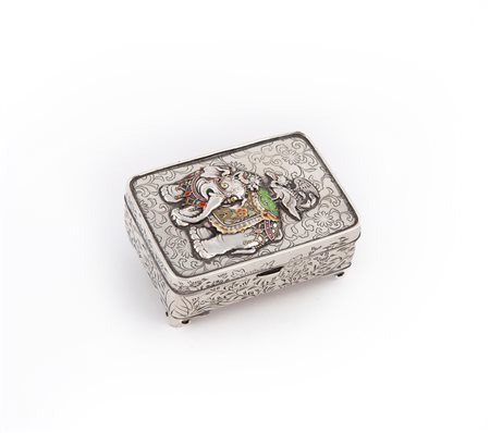 Scatola rettangolare in argento, Cina (?), inizi del XX secolo decorata sul coperchio da una figura di elefante bardato sormontato da un uccello fantastico resi in rilievo ed ornati da inserti in smalto; la restante superficie è abbellita da rami fioriti incisi; interno dorato estraibile, piedi a mensola, cm 3,3x8,2x5,7 - gr. 132