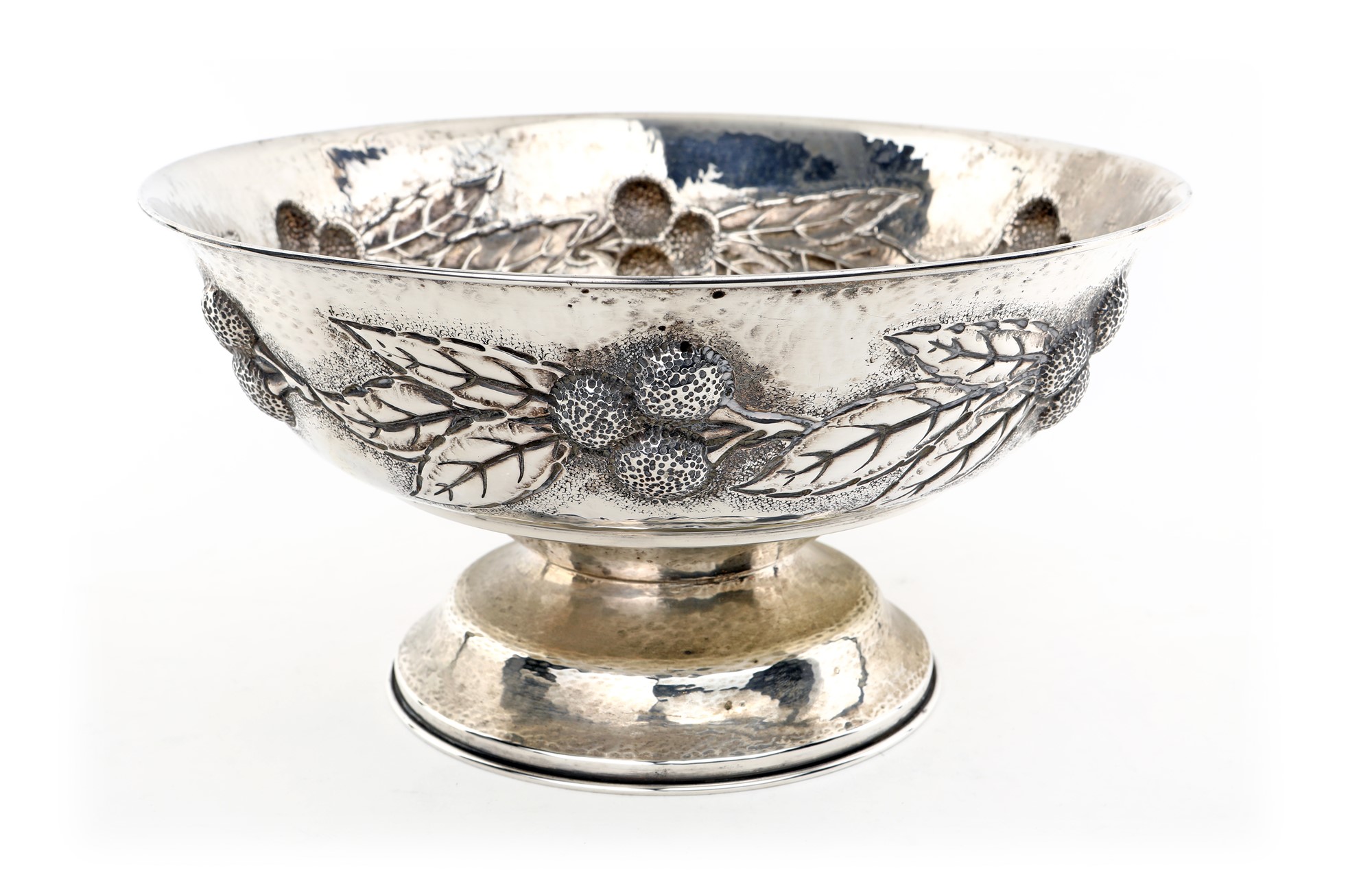 Grande coppa centrotavola in argento con circonferenza percorsa da tralci di ippocastano sbalzati , cm 16x31 - gr. 958