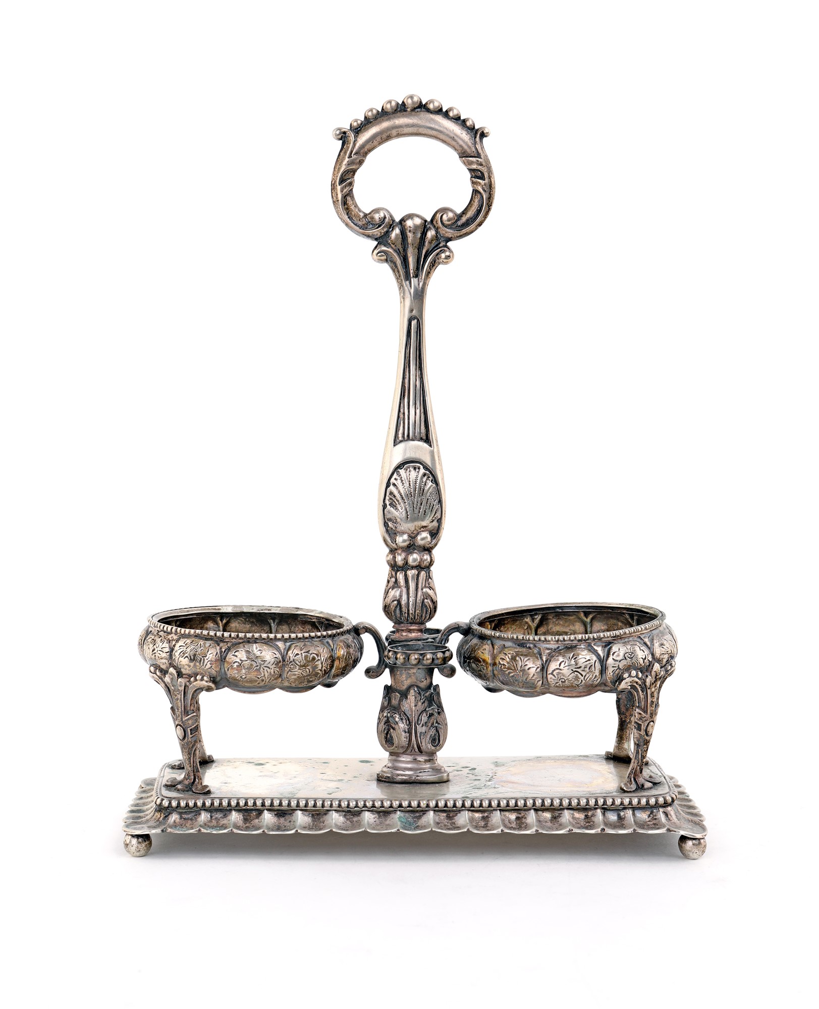 Oliera in argento con sostegno rettangolare perlinato sottolineato da profilo ad unghiature su piedini a sfera; due supporti circolari baccellati con decorazione incisa riuniti al montante centrale con presa ad anello. Ampolle mancanti, cm 27x21x9,5 - gr. 560