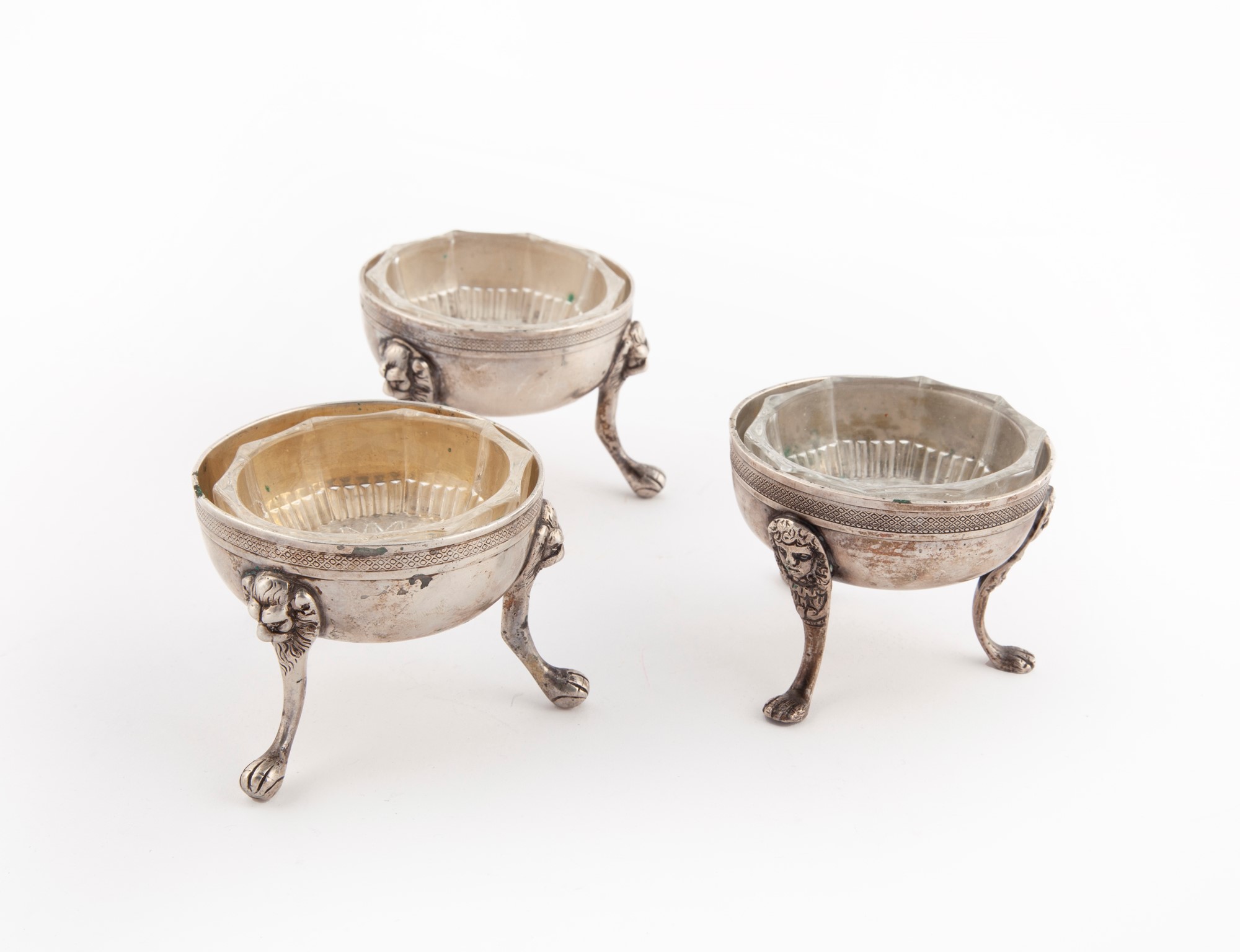 Tre antiche saliere in argento dalle analoghe caratteristiche con vaschetta semisferica sottolineata lungo la circonferenza da fascia bulinata; una coppia reca iniziali D.C. incise e poggia su tre gambe con protomi leonine; la terza con mascheroni. Provviste di vaschette in vetro intagliato non pertinenti, cm 5x6,5 - gr. 264
