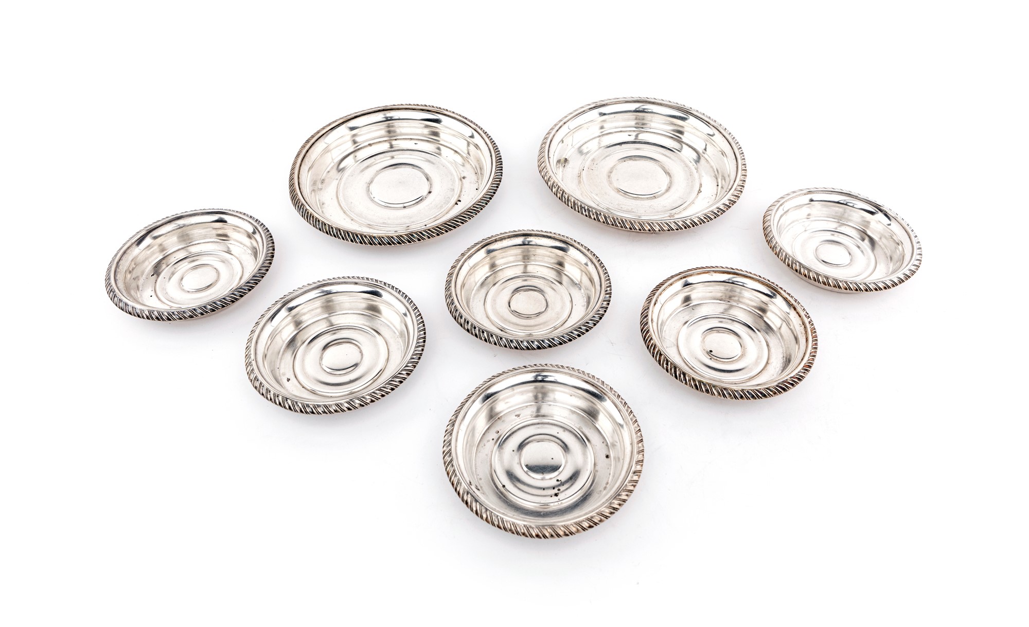 Lotto composto da coppia di sottobottiglia e sei sottobicchieri in argento, Milano 1850 ca. caratterizzati da orlo cordonato, cm 2x13,5 e cm 1,5x9 rispettivamente - peso complessivo gr. 416
