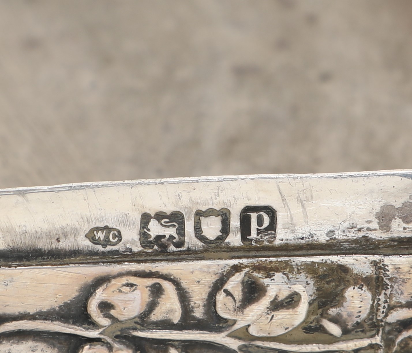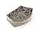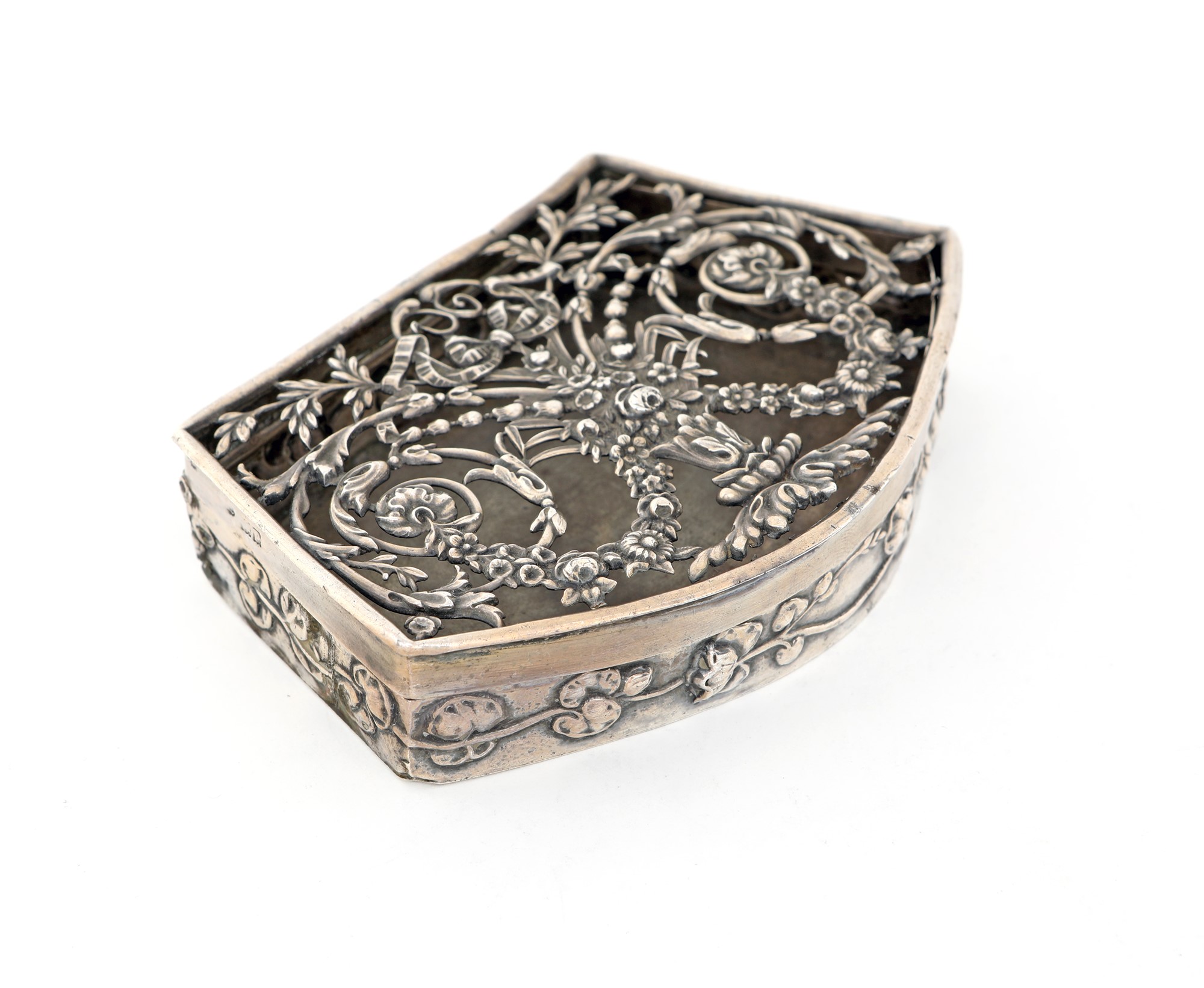 Scatola in argento, Inghilterra di forma trapezoidale con coperchio incernierato traforato e fascia percorsa da un tralcio sbalzato, cm 2,5x11,5x7,8 - gr. 102