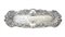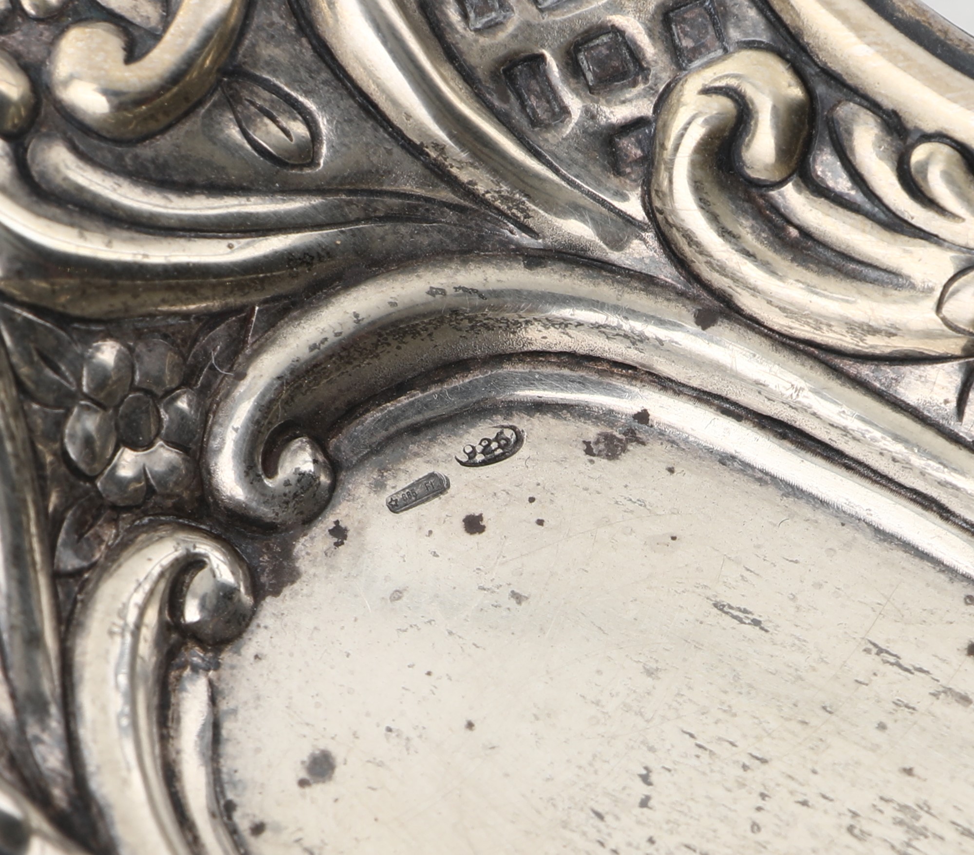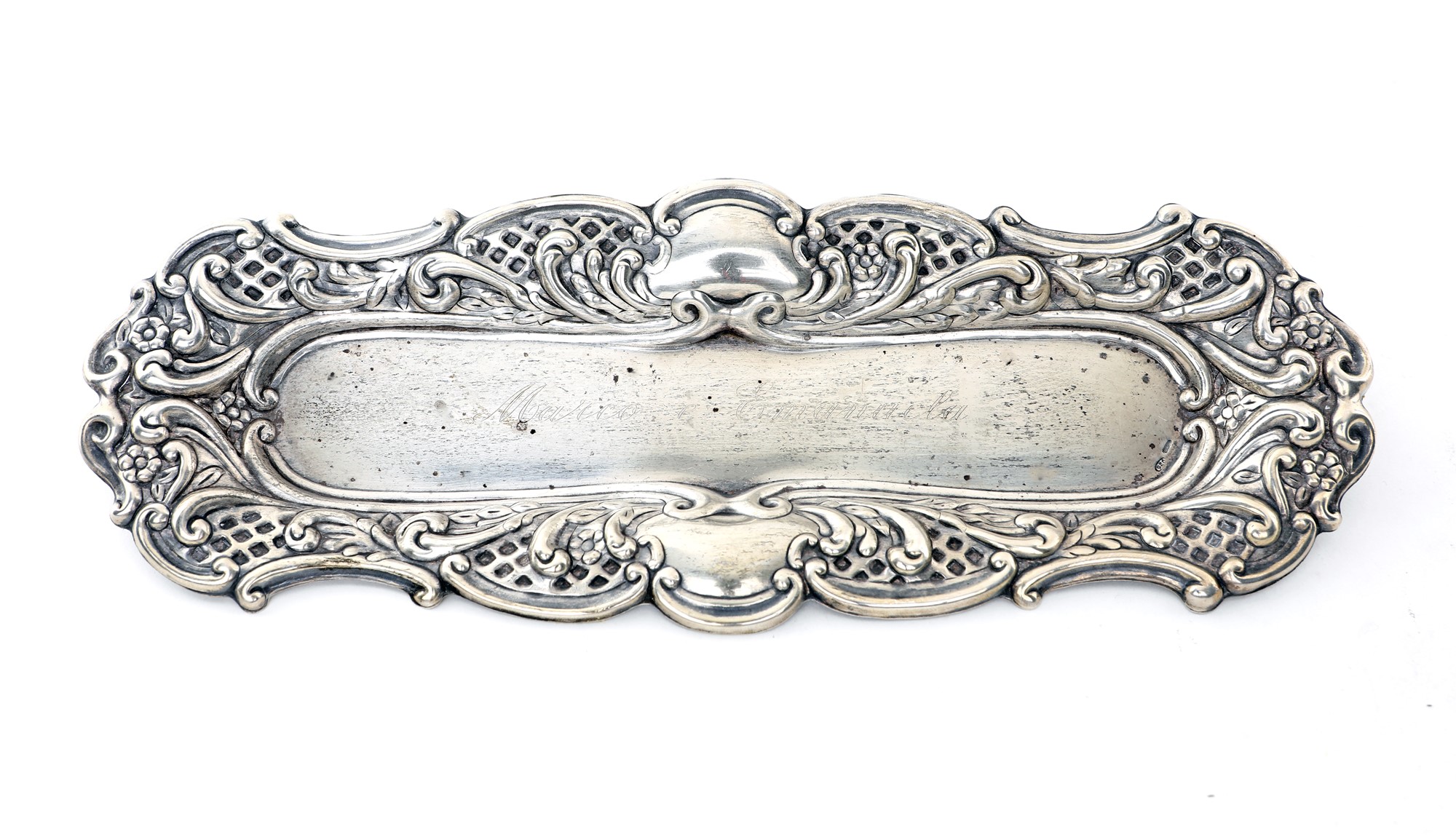 Vassoietto portapenne in argento con decorazione a sbalzo lungo la tesa e nomi incisi sul piatto, cm 24x9 - gr. 138