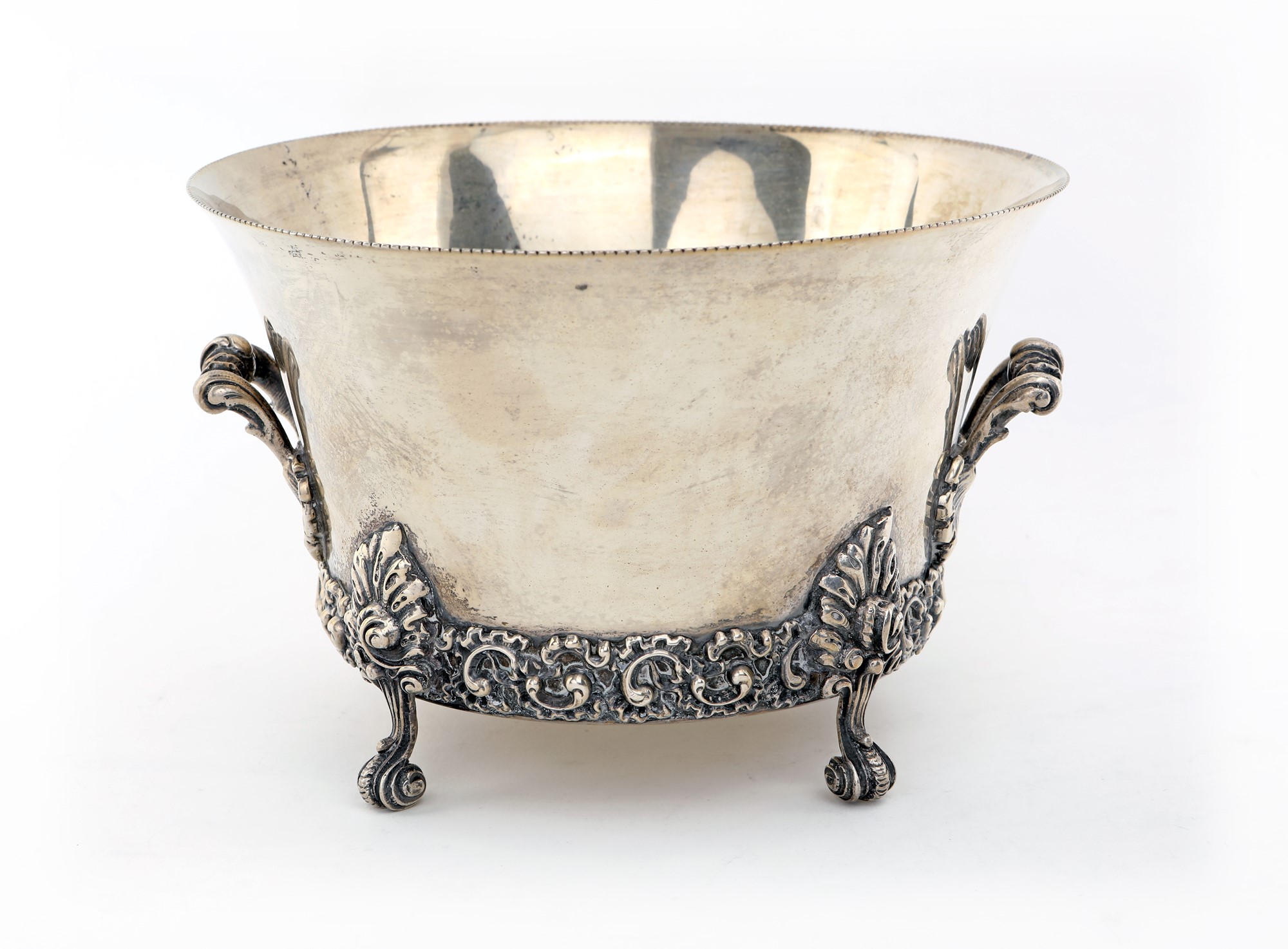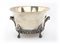 Centro tavola in argento 800/1000 di forma circolare lievemente svasata, caratterizzato da una bordura inferiore applicata costituita da volute e cartouches; sorretto da quattro piedi a ricciolo introverso, reca due anse con attacchi a palmetta, cm 13,5x20 - gr. 755