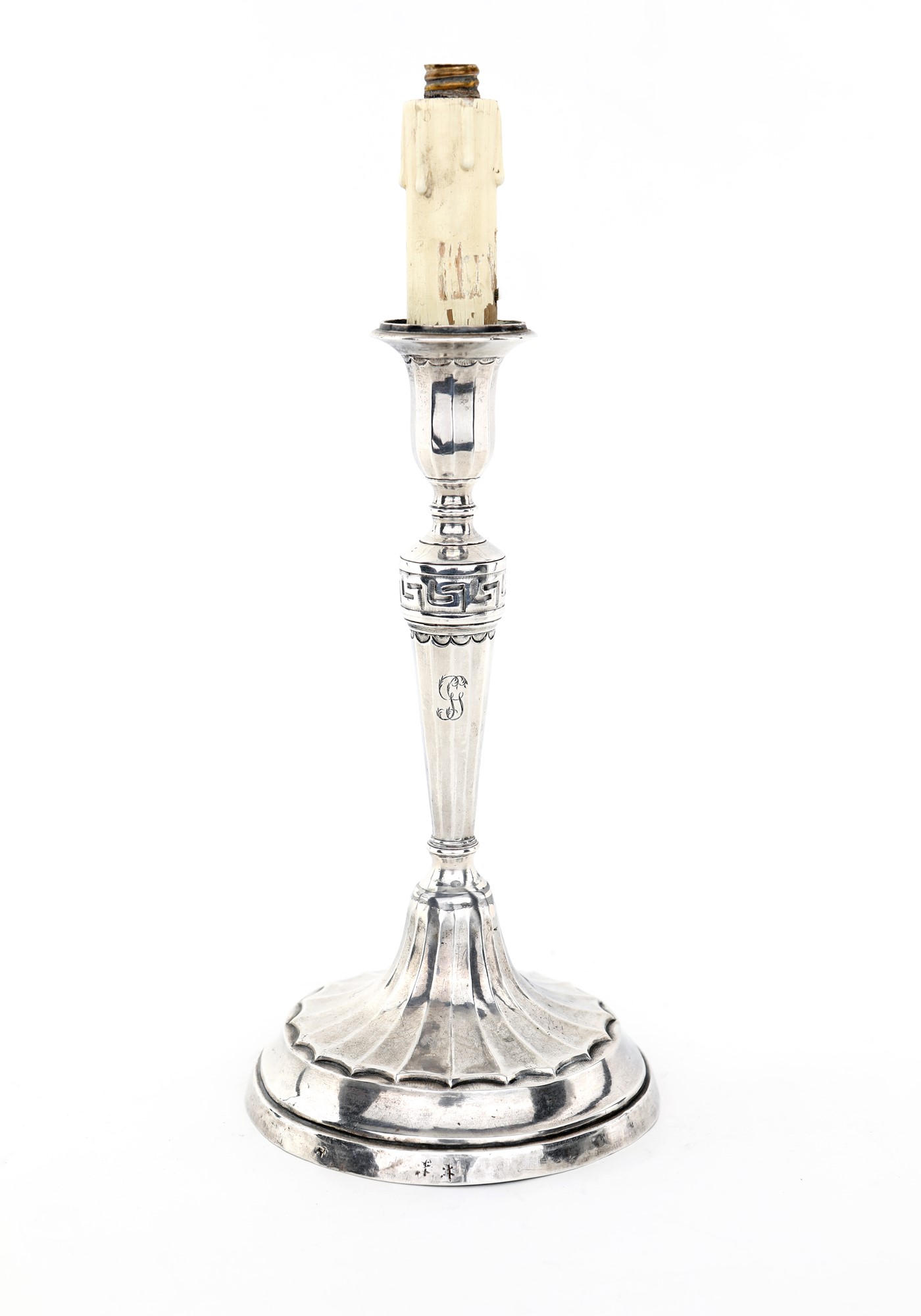 Candeliere in argento stelo rastremato sfaccettato con profilo superiore sottolineato da greca; piede circolare, altezza cm 22,5 - gr. 300 lordo