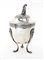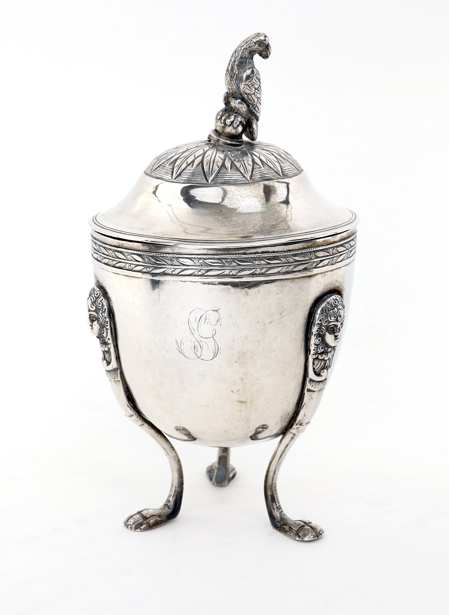 Zuccheriera con coperchio, Napoli, prima metà del XIX secolo con corpo a uovo sorretto da tre gambe incurvate con piedi ferini e attacchi in forma di cariatide; coperchio a cupolino dominato da un pappagallo. Difetti, cm 19,5x10,4 - gr. 410