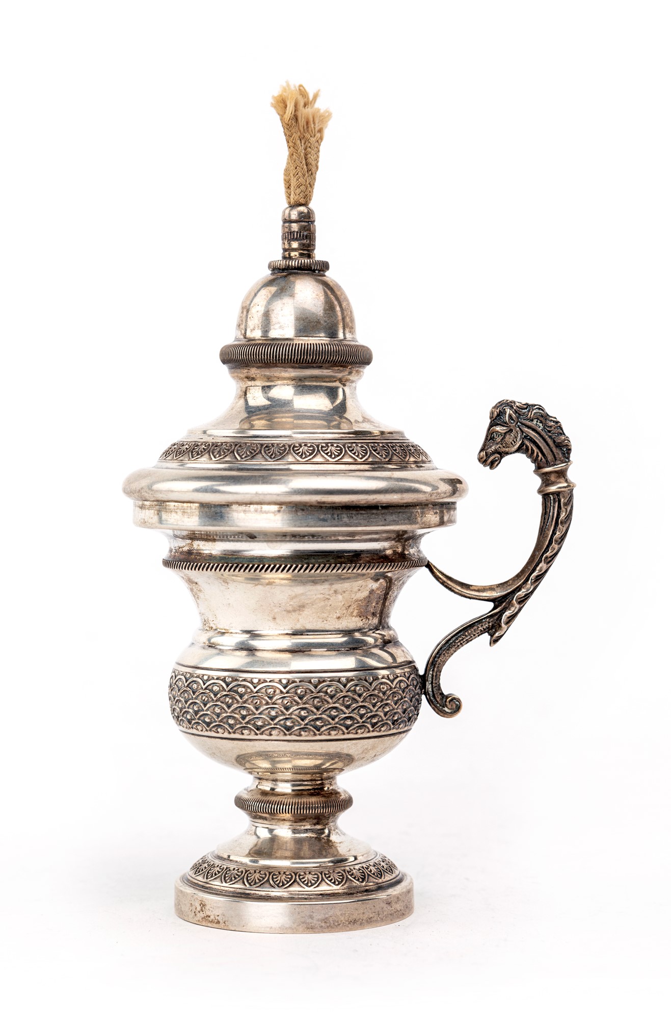 Stoppiniera in argento, Firenze, 1960 a forma di coppa con coperchio su piede circolare, decorati da palmette e motivi a scaglie cesellati; manico sagomato con terminale in forma di testa equina, altezza cm 14 - gr. 138