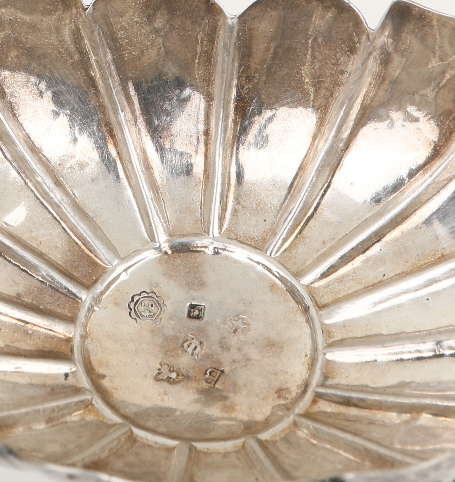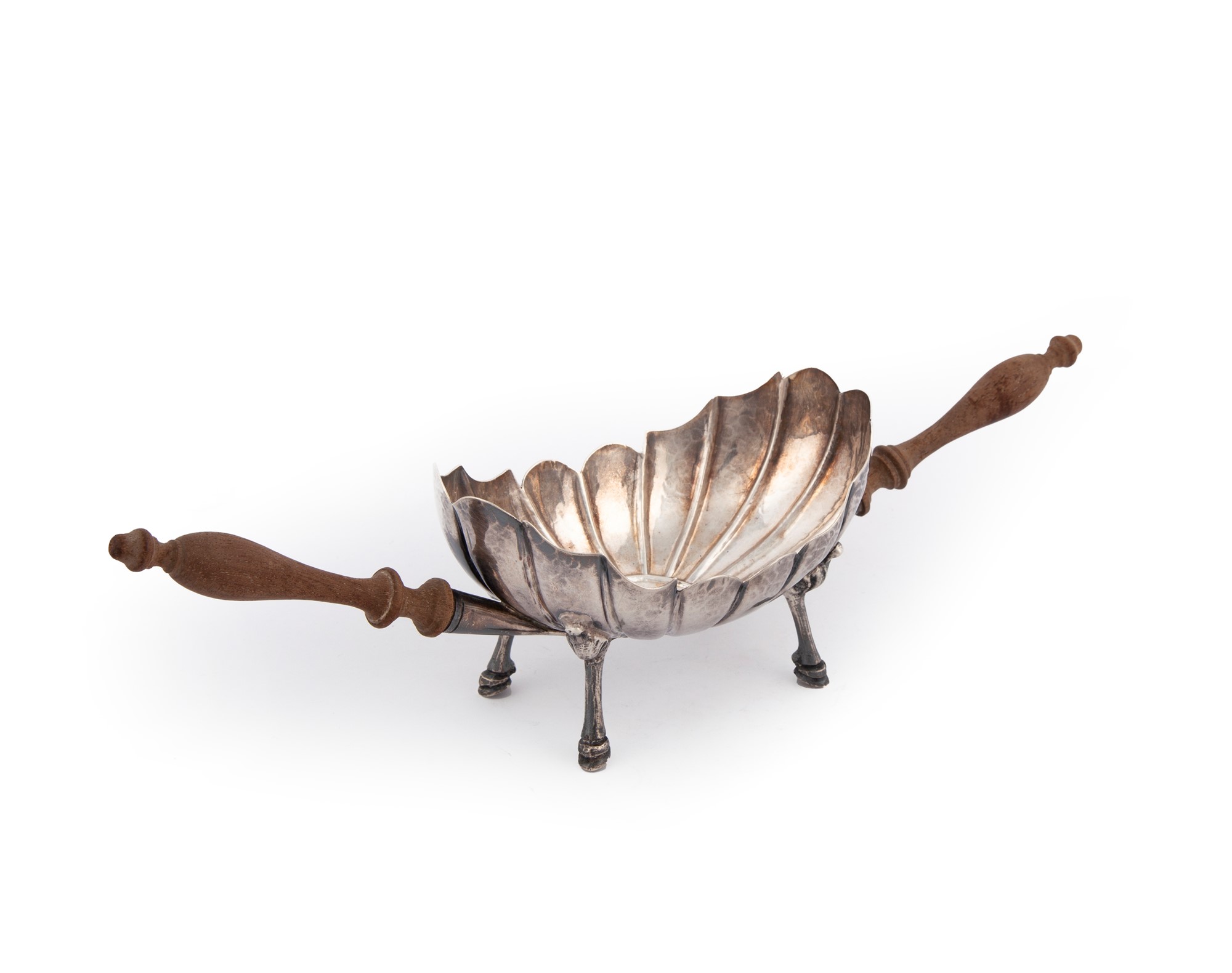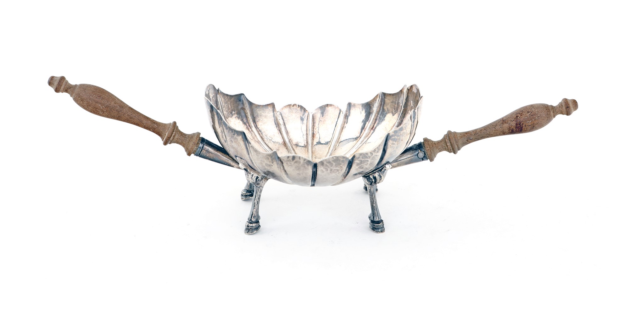 Navicella in argento con corpo percorso da scanalature ed orlo superiore mistilineo, caratterizzata da manici in legno tornito e poggiante su quattro gambe con piedi a zoccolo, cm 6x24x6,5 - peso lordo gr. 74
