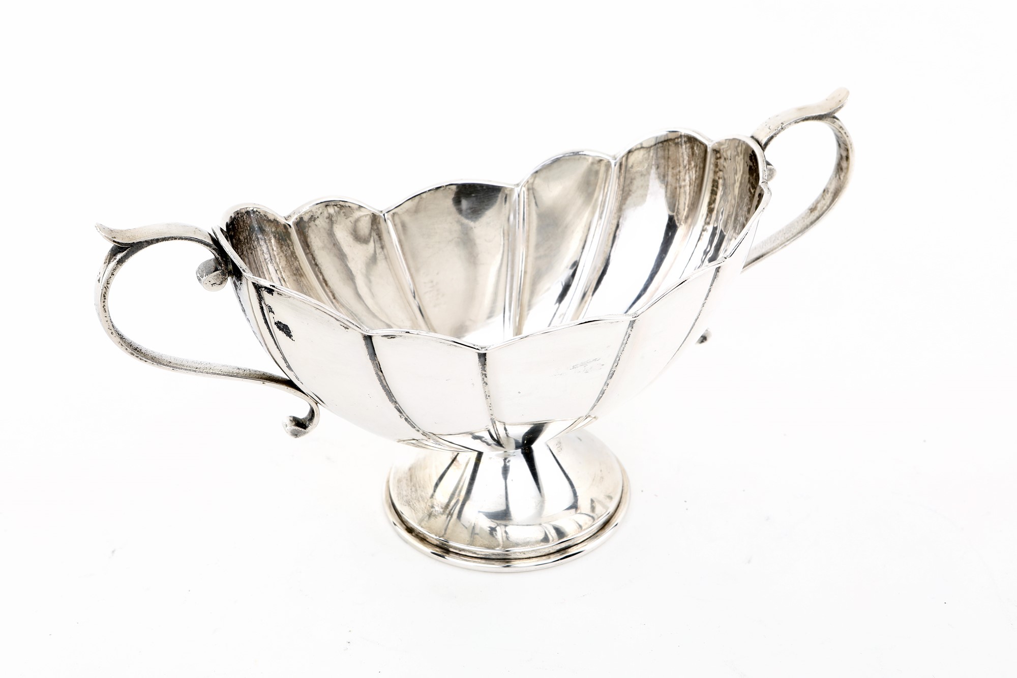 Salsiera biansata in argento, XIX secolo forma di coppa ovale con corpo costolato e profilo centinato; manici arcuati, piede circolare , cm 12,5x25x10 - gr. 342