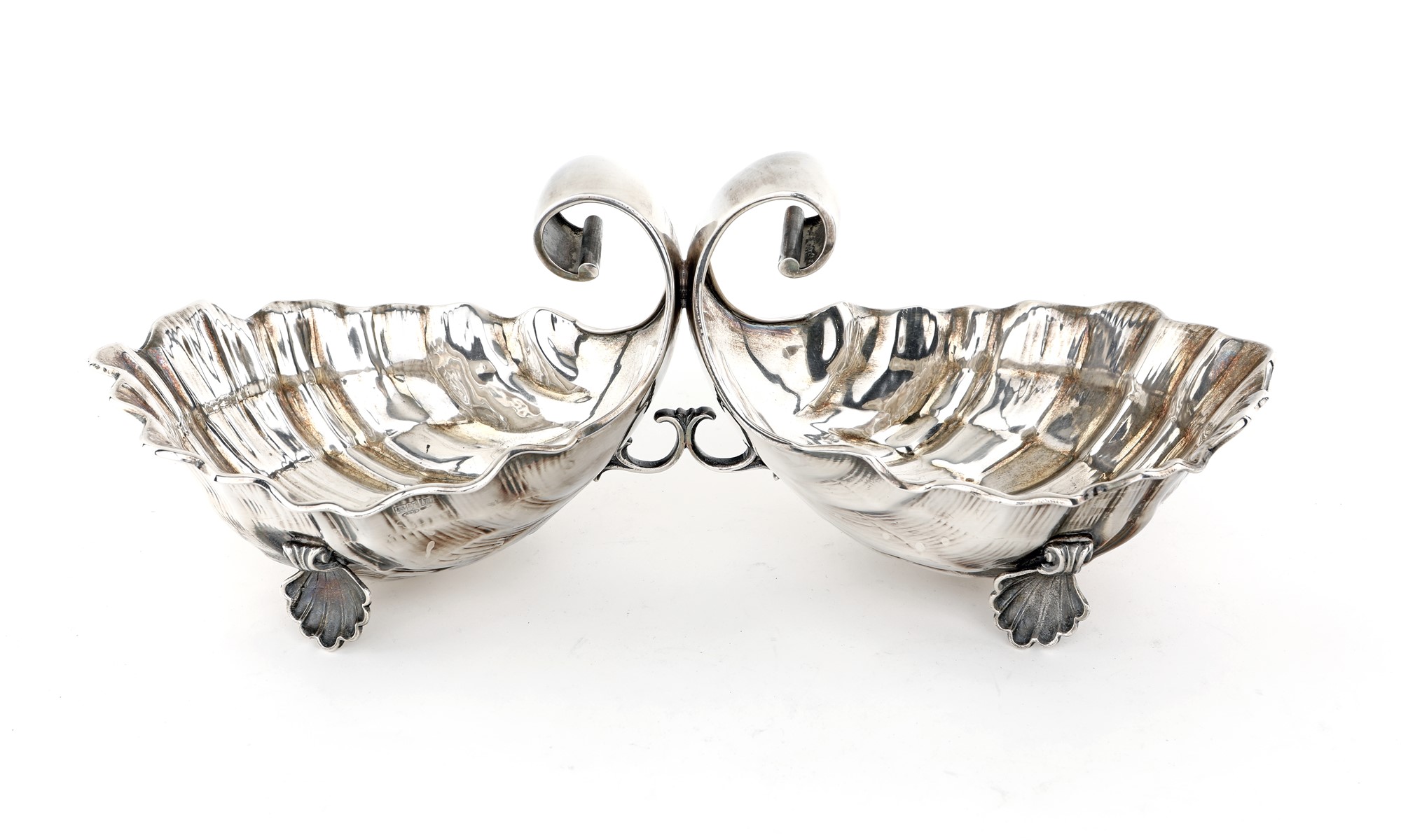 Antipastiera in argento con due vaschette a forma di conchiglia contrapposte e con vertice incurvato a modo di presa; piedi a valva, cm 12,5x35x14 - gr. 638