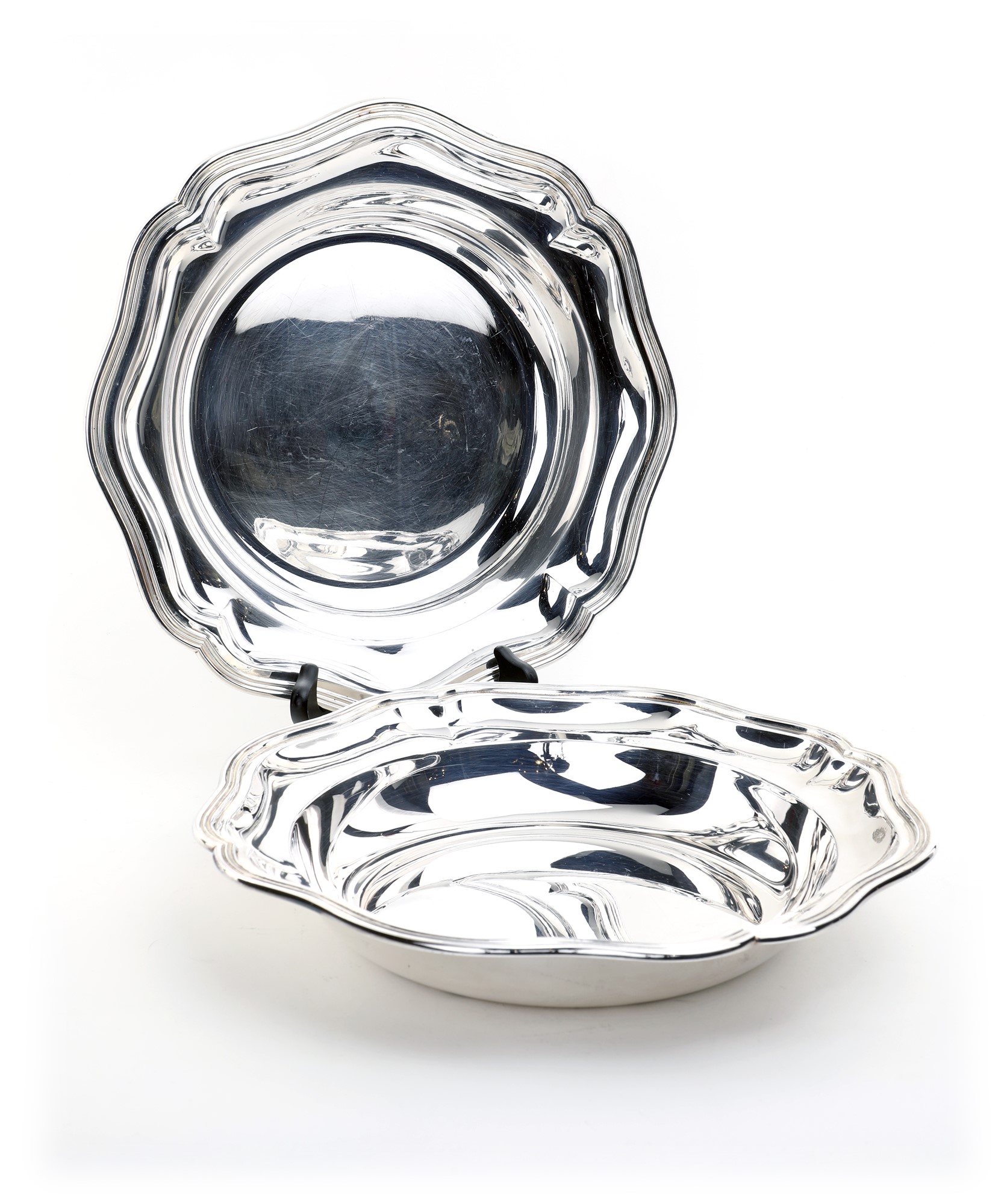 Coppia di piatti fondi da portata in argento di forma circolare con tesa sagomata e ciglio modanato, cm 5,5x33 - gr. 1678