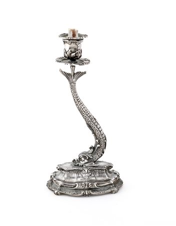 Candeliere in argento 925, Federico Buccellati stelo scultoreo in forma di delfino sulla cui coda poggia il vaso reggicandela; base ovale, cm 24,5x12x9 - gr. 700 lordi