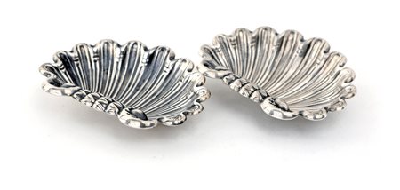 Coppia di piccoli posacenere in argento a forma di valva di conchiglia, cm 6,5x5 - gr. 40