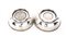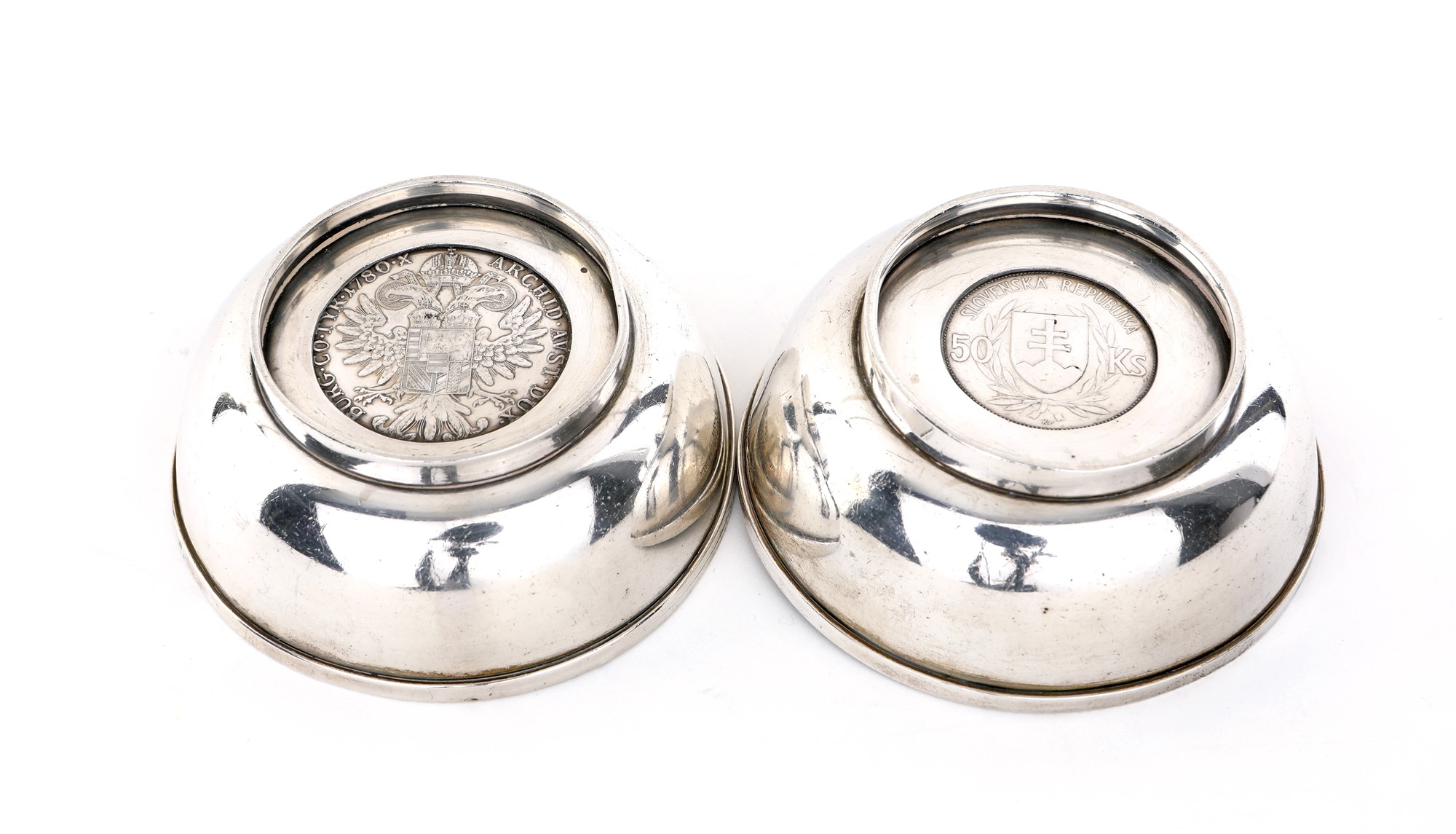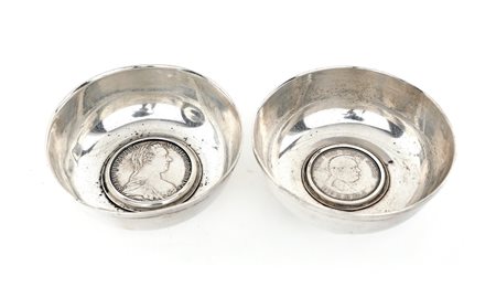 Coppia di coppette in argento sterling, Massoni, Roma caratterizzati da monete di Maria Teresa d'Austria datata 1780 e 50 corone della repubblica slovacca (quinto anniversario), 1944, cm 3,5x9 - gr. 224