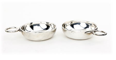 Coppia di piccoli tastevin in argento 925, Bulgari di forma circolare con manico ad anello ed estremità a testa di serpe stilizzata, cm 2,3x9,8x7,2 - gr. 128