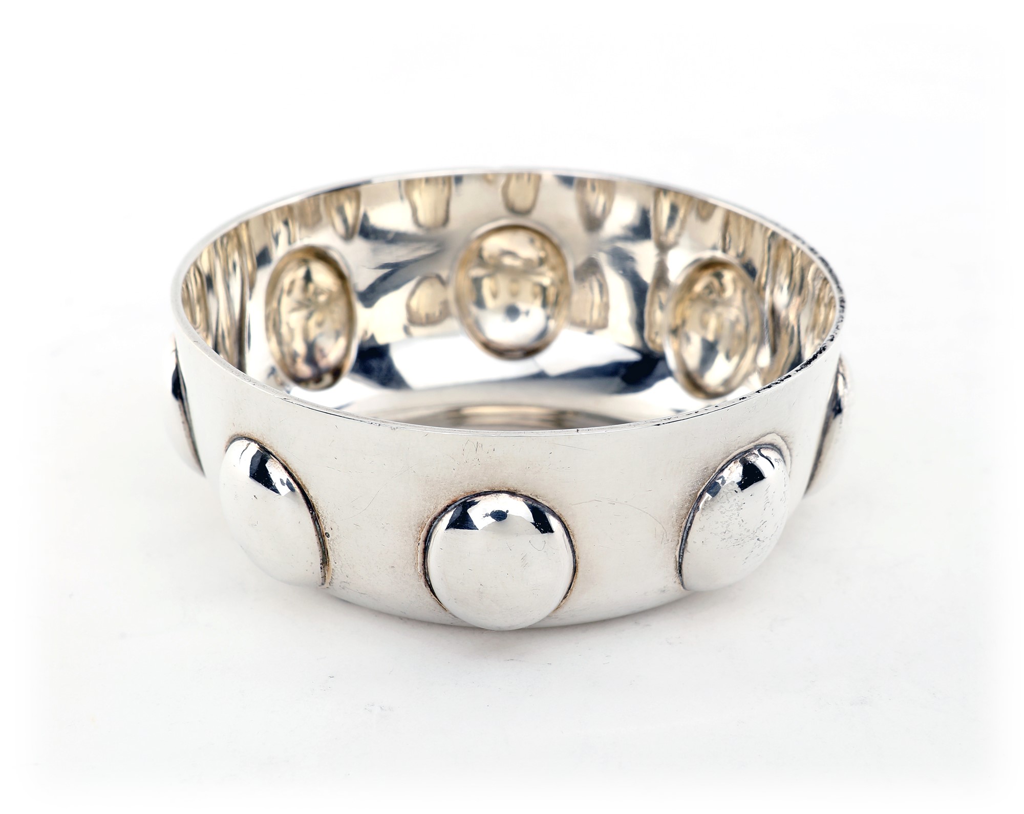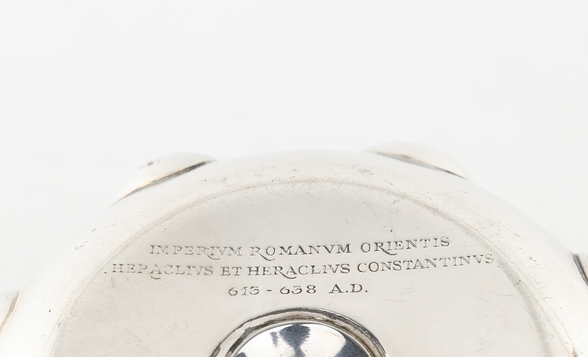 Piccolo bowl in argento 950, Bulgari caratterizzato da otto ovali cabochon disposti lungo la circonferenza; al centro rimossa la moneta originale. Iscritto sotto la base "Imperium Romanum Orientis Heraclius et Heraclius Constantinus 613 - 638 A.D.", cm 3,4x8,5 - gr. 162