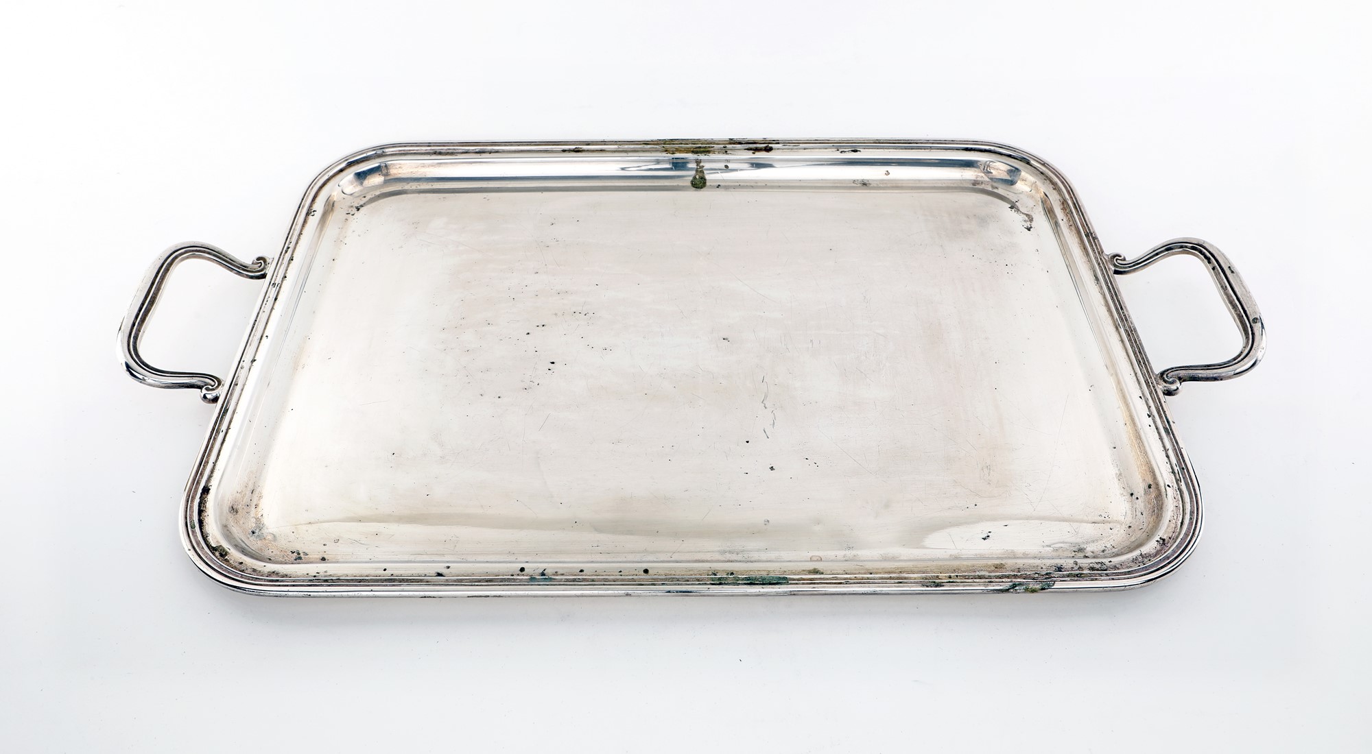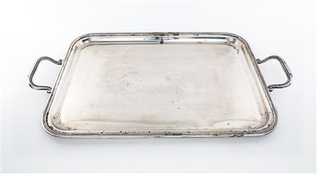 Vassoio in argento con manici di forma rettangolare con angoli arrotondati ed orlo modanato, cm 57x32,5 - gr. 1682