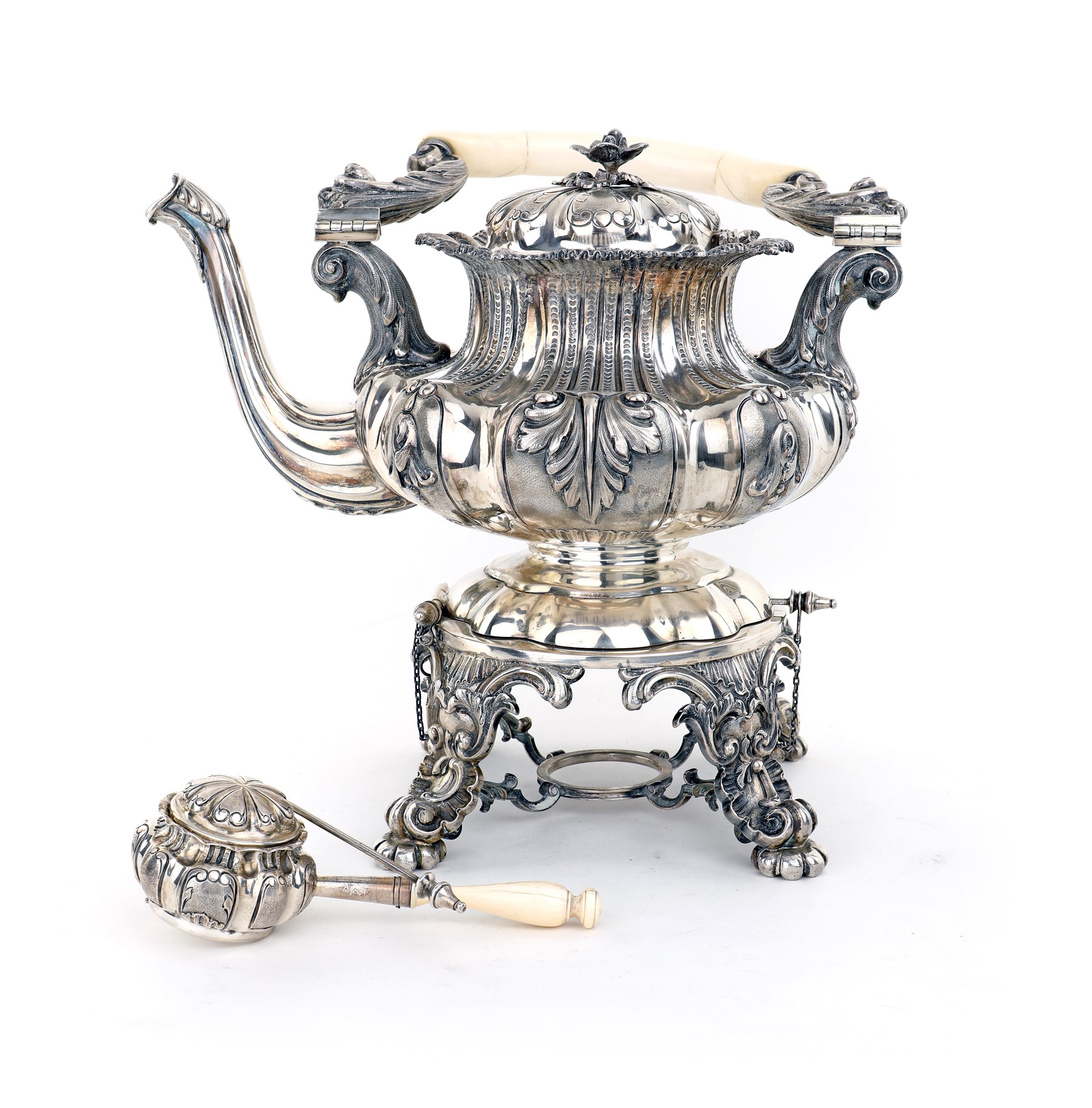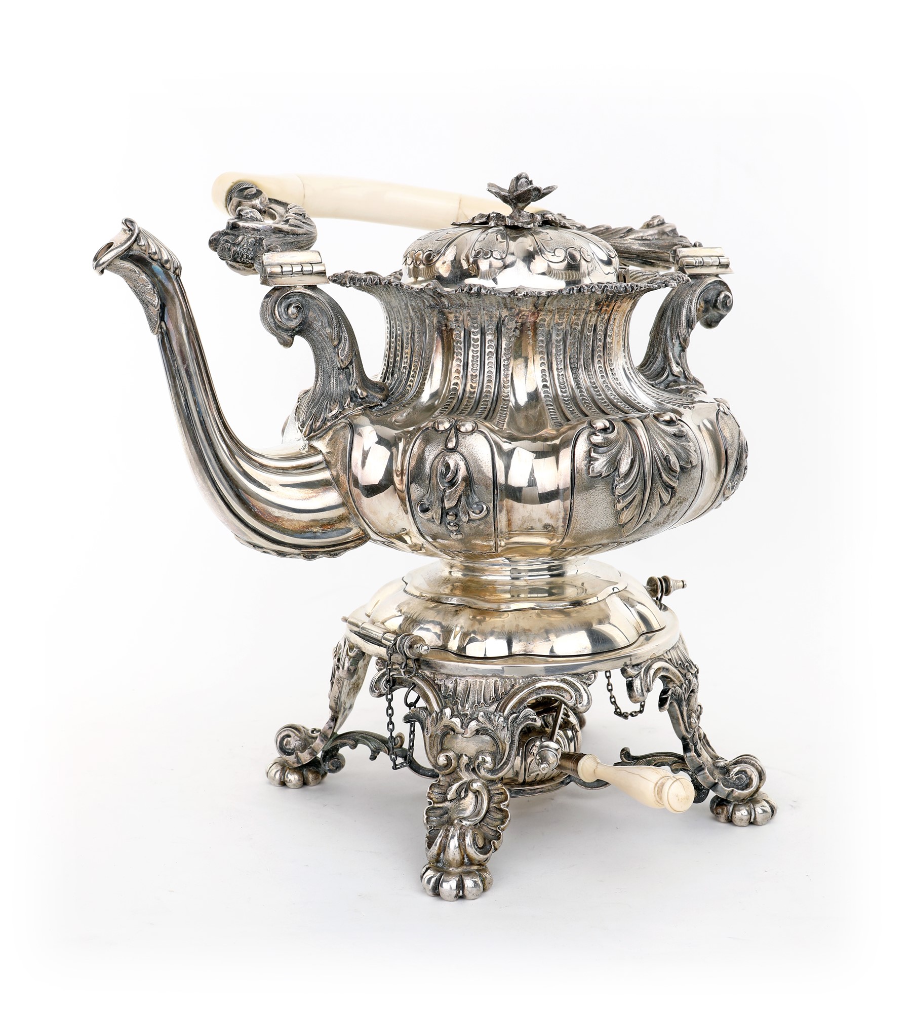 Grande teiera in argento con rechaud, argentieri Fratelli Leone, Milano , cm 42x32x20 - peso complessivo gr. 2804