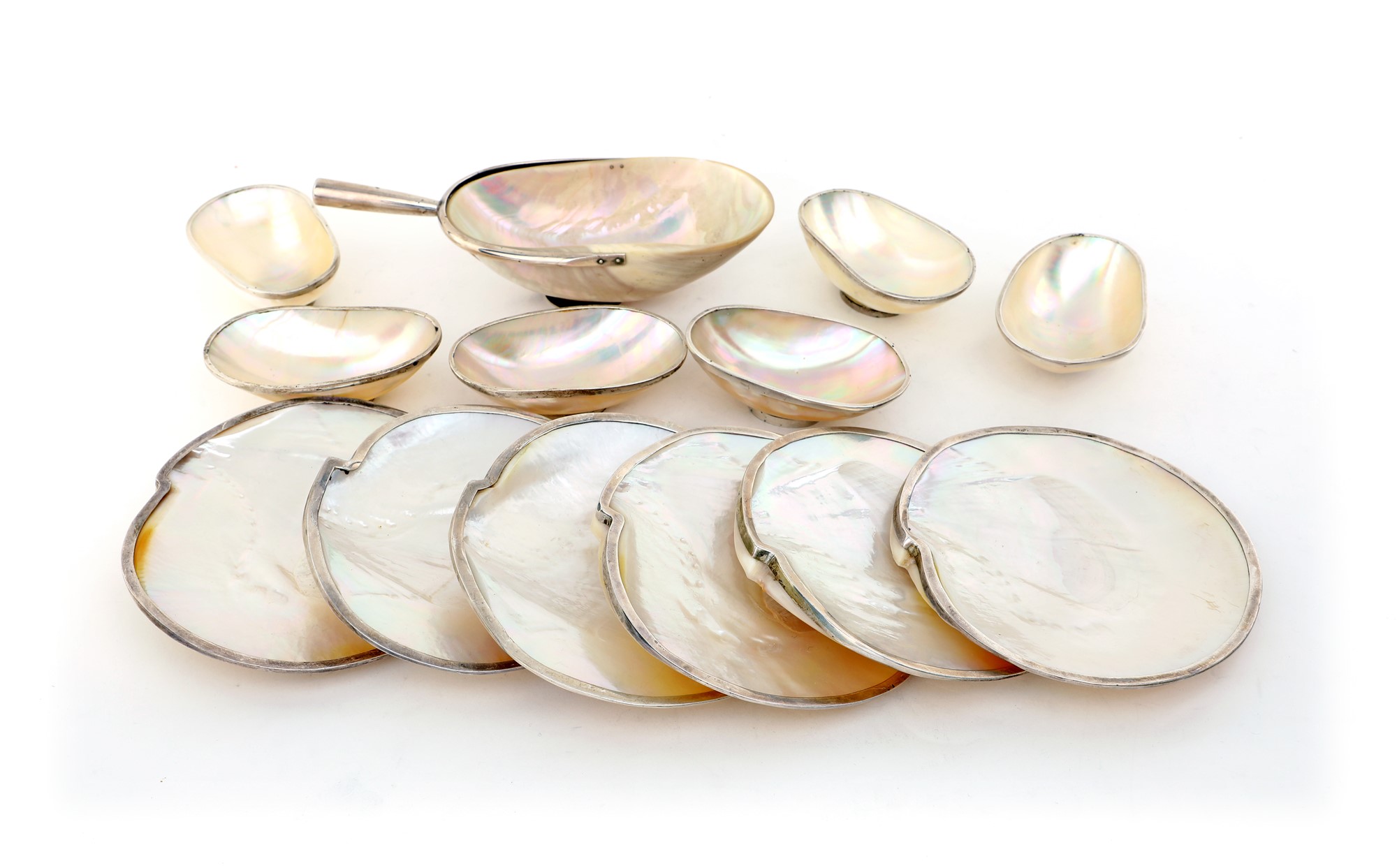 Servizio da cocktail in madreperla naturale bordata in argento 925 composto da sei coppette costituite da conchiglie di abalone, sei piatti a valva sorretti da piedini a sfera in argento ed una coppetta più grande con manico; quest'ultima punzonata Gucci Boutique. Un piedino mancante , cm 3x10x6,5 ca. - cm 15x14 e cm 6,5x22,5x9,5 rispettivamente