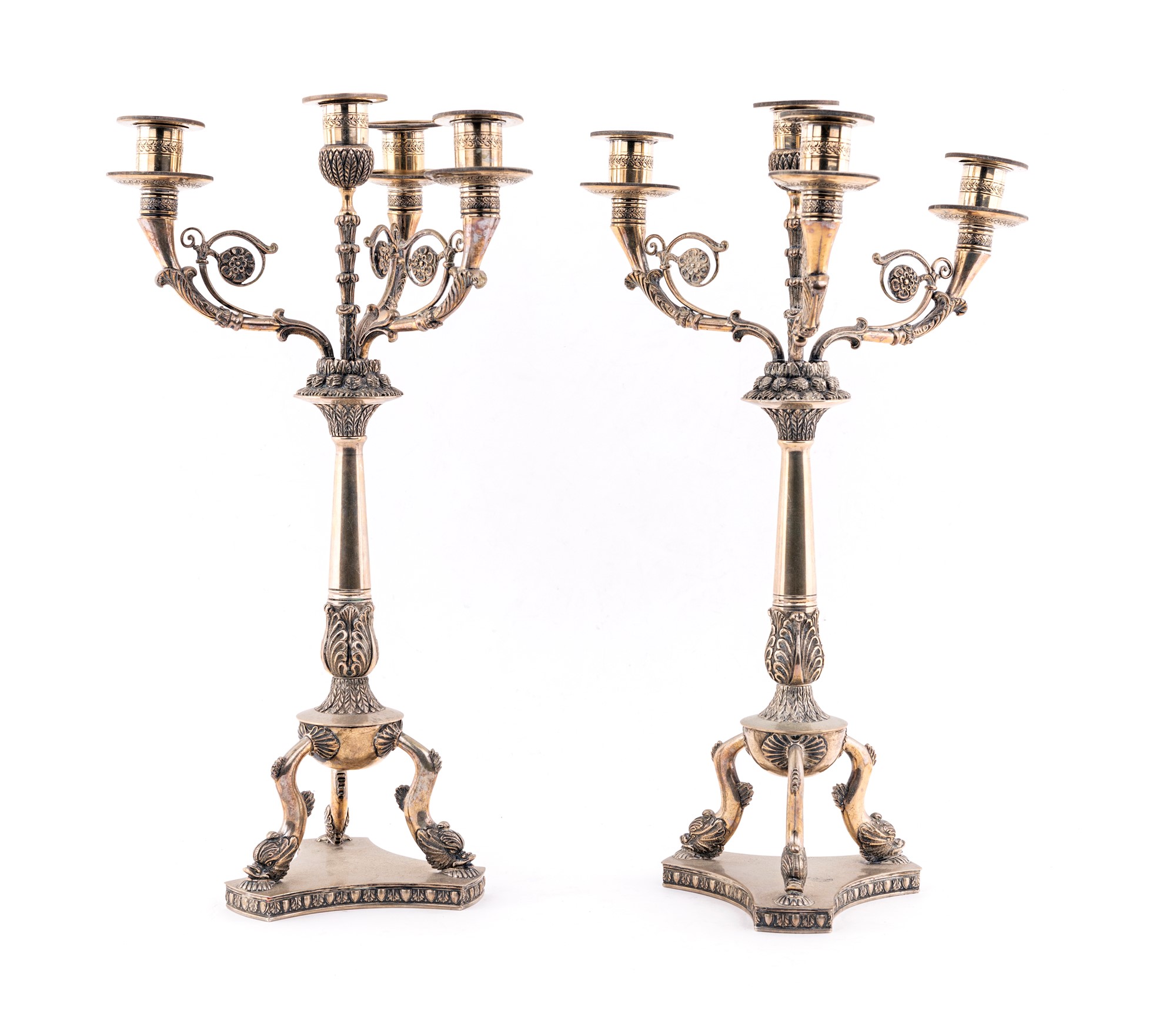 Coppia di candelabri in argento 800 a quattro luci con bracci emergenti dalla sommità di una colonna dominata da un cespo fogliaceo; tre figure di delfino fungono da sostegni, base triangolare percorsa da palmette alternate ad ovoli, altezza cm 41 - peso complessivo gr. 2686