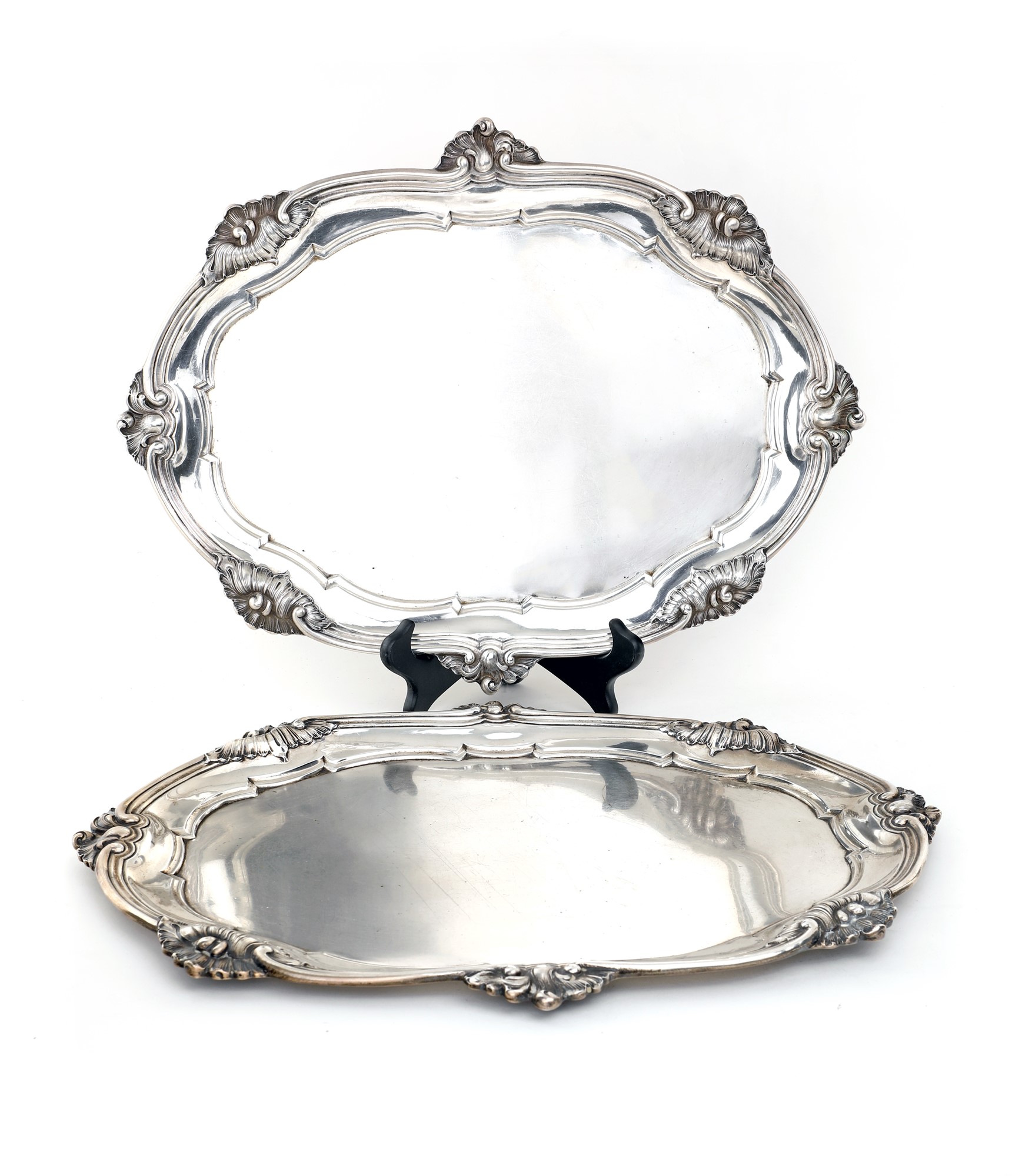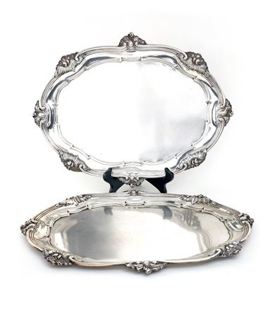 Coppia di vassoi in argento di forma ovale sagomata, con tesa sbalzata racchiusa da volute intervallate a cartigli. Entrambe privi di bollo di titolo, cm 48x36 - peso complessivo gr. 2294