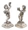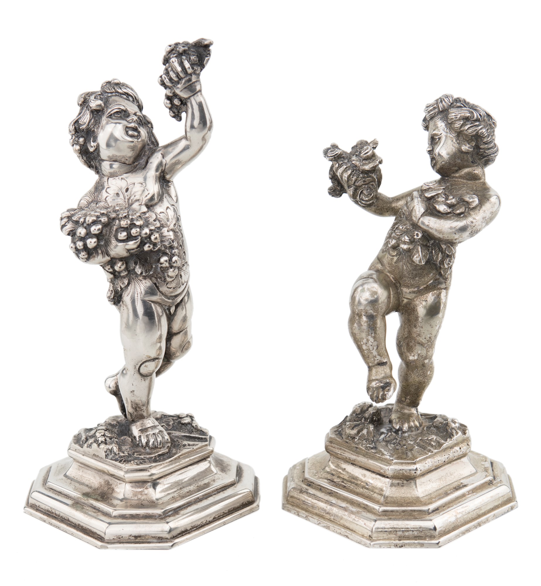 Coppia di sculture allegoriche in argento 800/1000, Milano, Anni Cinquanta, argentiere Francesco Caputo raffiguranti la Primavera e l'Autunno rappresentate da figure di amorino danzante ritratte rispettivamente con fiori e grappoli d'uva; bassi piedistalli squadrati e gradinati, altezza cm 15,2 - gr. 900