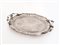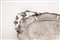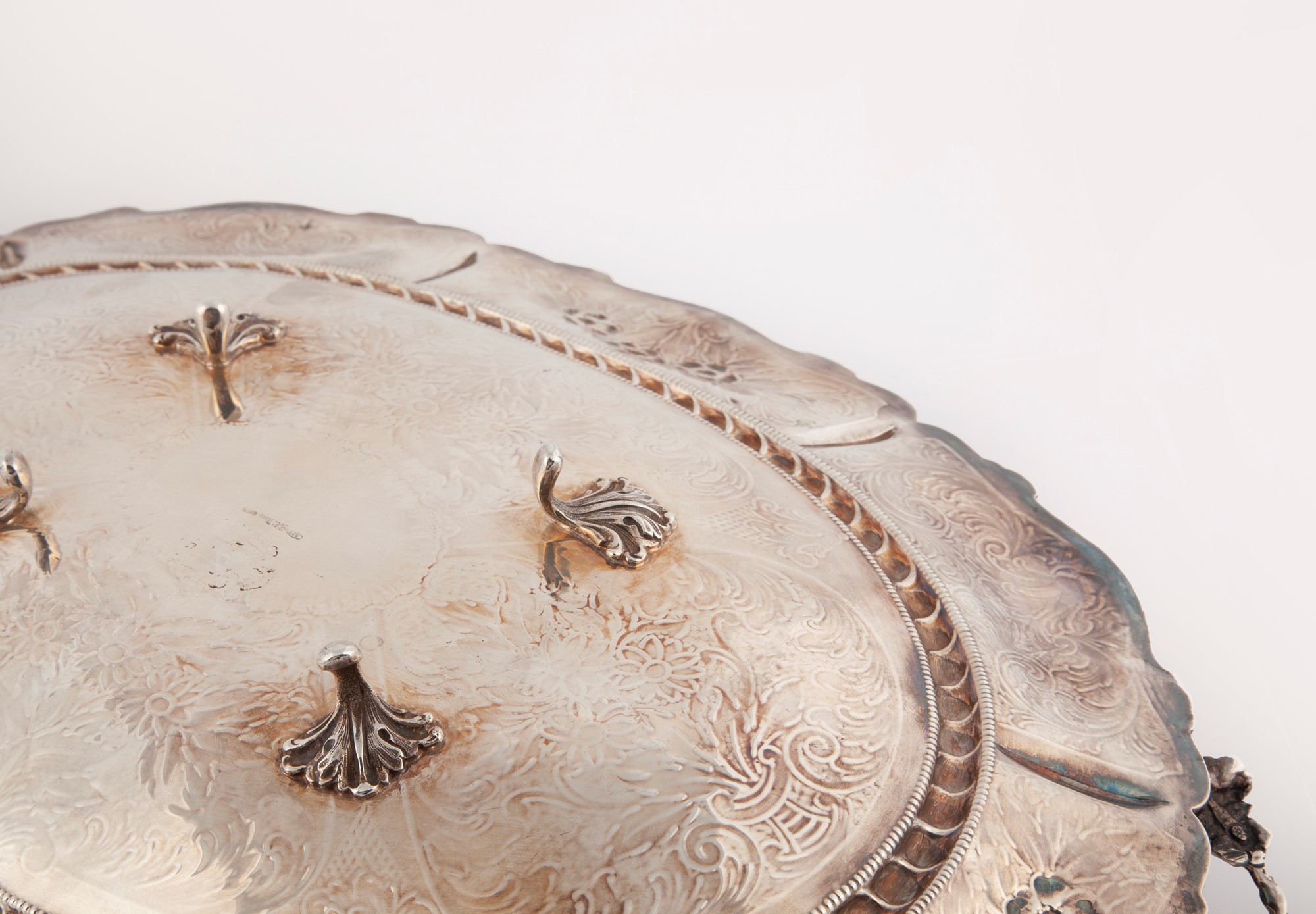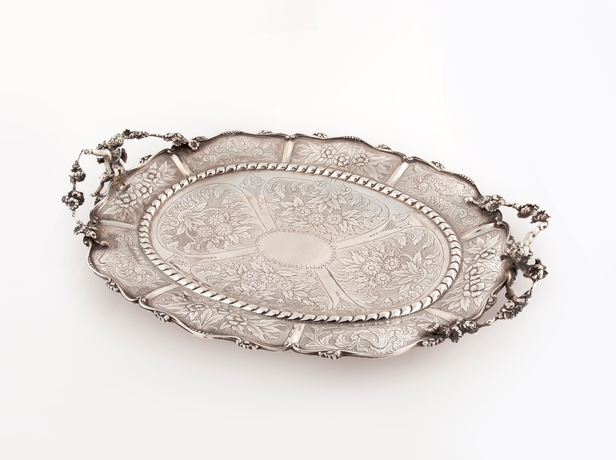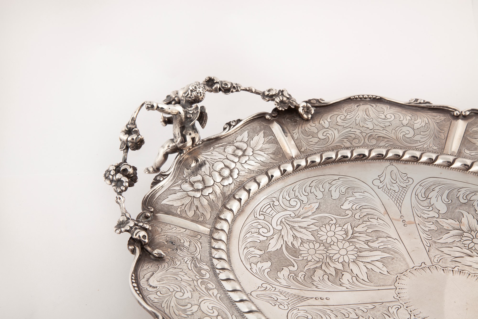 Vassoio centrotavola in argento, Marco Poli decorato entro riserve da composizioni floreali e motivi vegetali incisi su fondo bulinato; parte centrale racchiusa da cordolo in rilievo, profilo sagomato sottolineato da perline sparse, manici a forma di ramo fiorito sostenuto da figure scultoree di amorino; piedi cesellati a motivi vegetali, cm 47x32 - gr. 1770