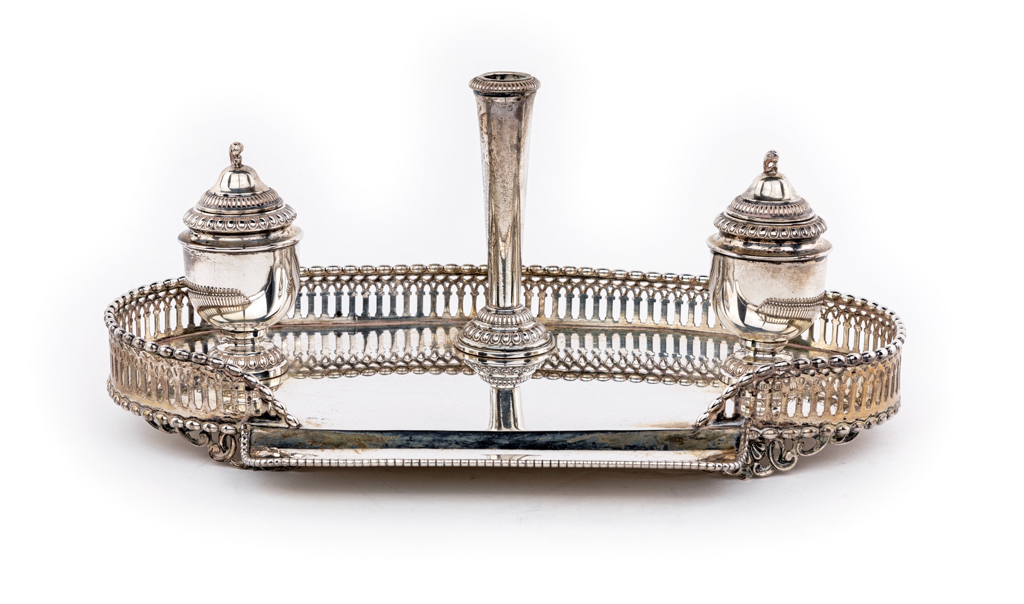 Calamaio in argento, Italia, seconda metà del XX secolo con vassoio ovale cinturato da ringhierina traforata su cui si imperniano un portapenne centrale e due portainchiostro a guisa di vaso ad urna con bicchierino interno in metallo, cm 12,5x29x16 - peso complessivo lordo gr. 660