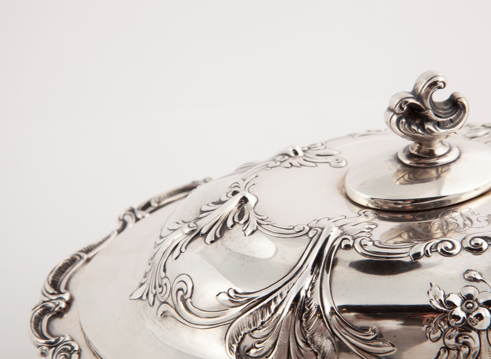 Coppia di legumiere con coperchio in argento sterling, Gorham, 1860 - 1870 di forma ovale con ampia tesa sottolineata da volute vegetali, elementi decorativi ripresi come ornamento dei coperchi , cm 12x26,5x19,7 - gr. 1712