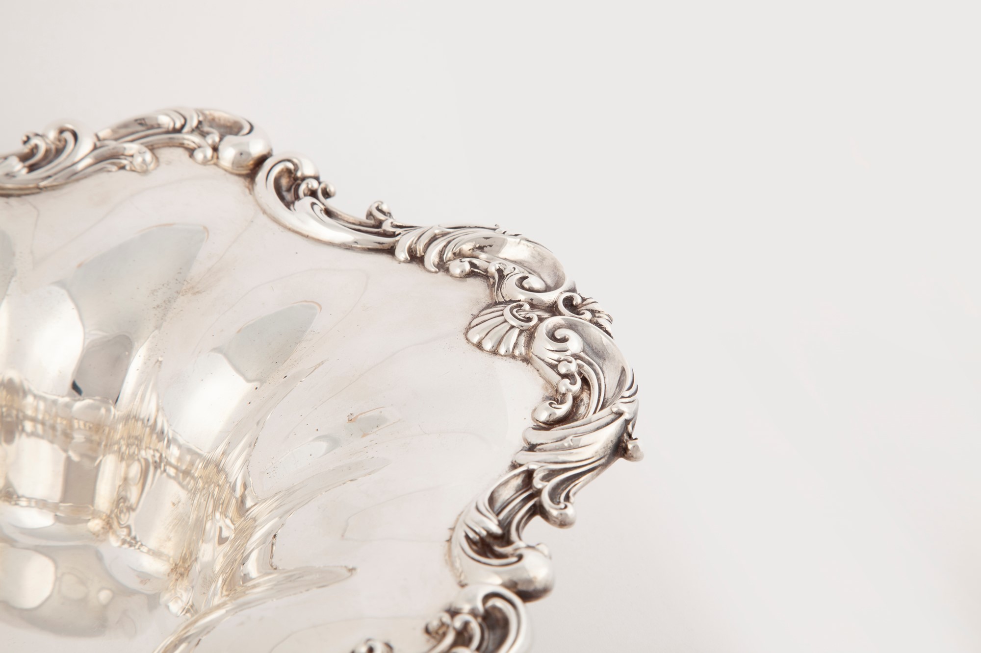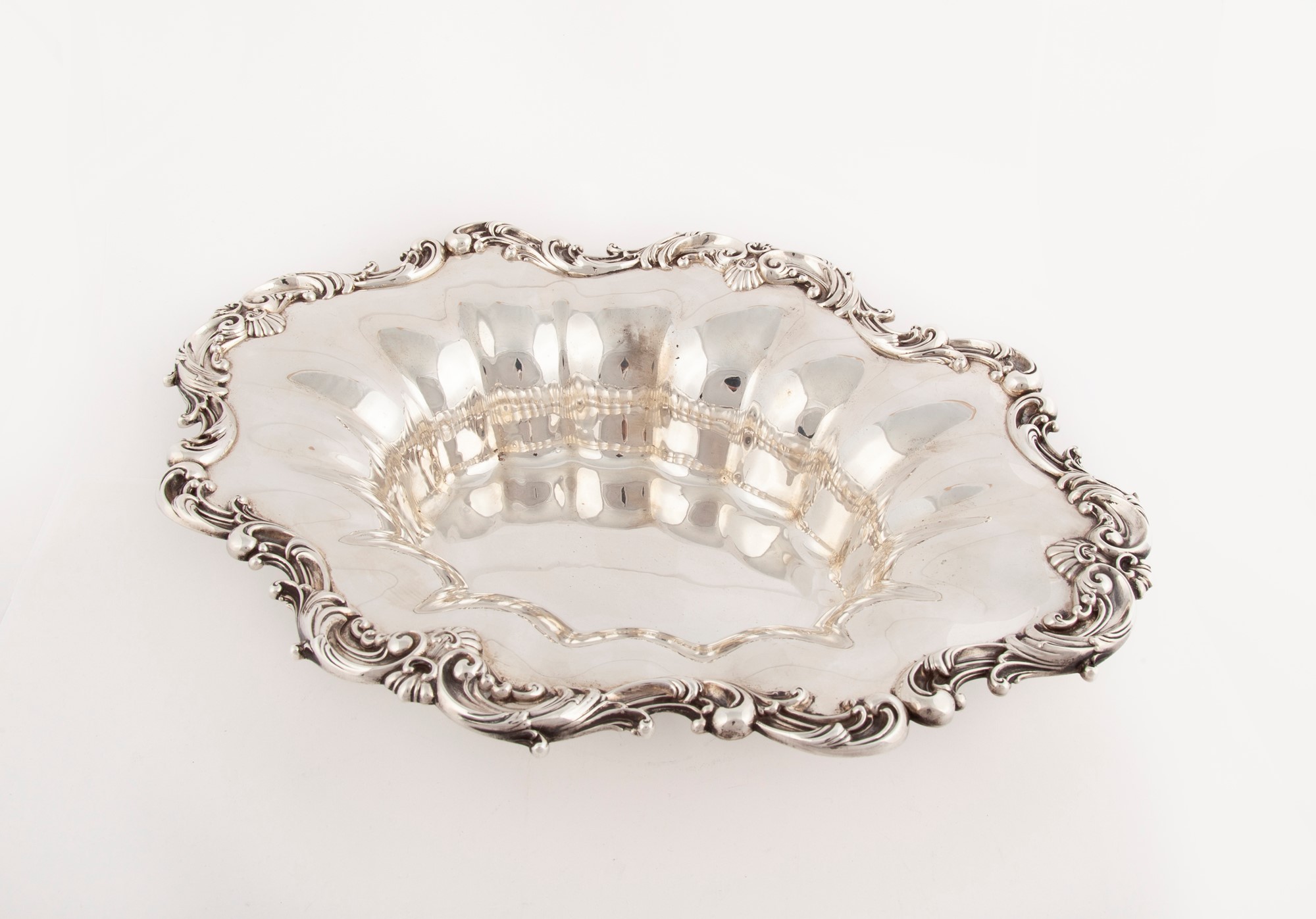 Centrotavola in argento sterling, Whiting Manufacturing & Co (1866 - 1924) di forma ovale con ampia tesa incurvata e bombata racchiusa da volute vegetali variamente ricurve, cm 6,5x36x27,5 - gr. 640
