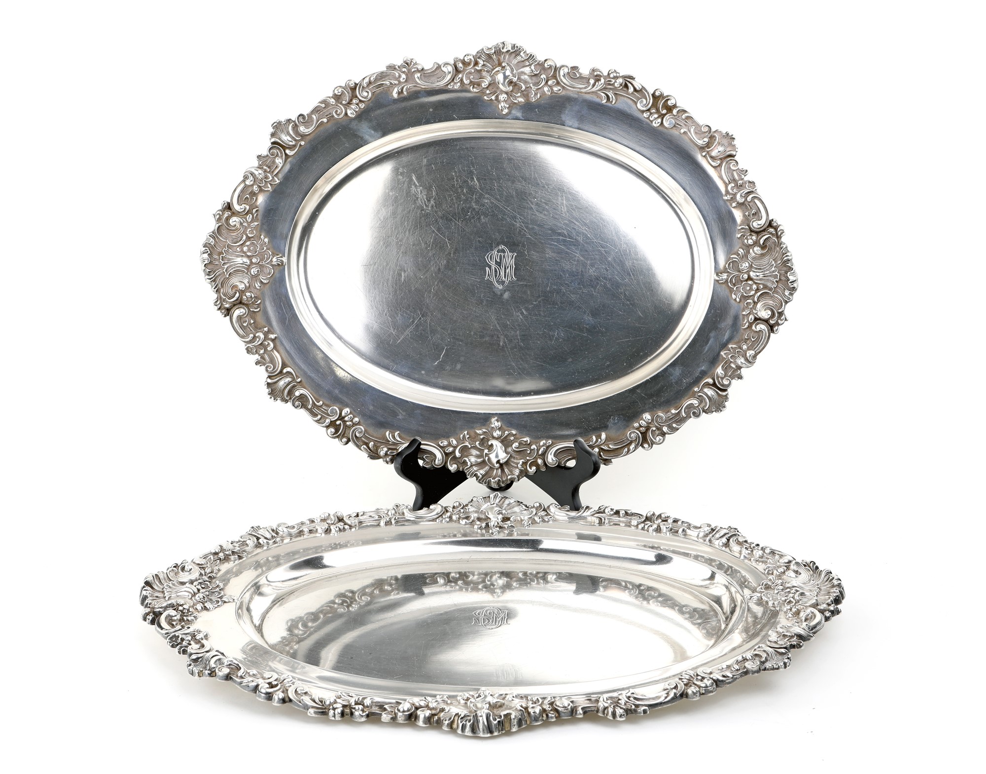 Coppia di vassoi ovali in argento sterling, argentiere Black, Starr & Frost, Stati Uniti 1874 - 1908 centrati da monogramma inciso e racchiusi da volute vegetali, fiori e cartigli in rilievo, cm 50x37 - peso complessivo gr. 2960