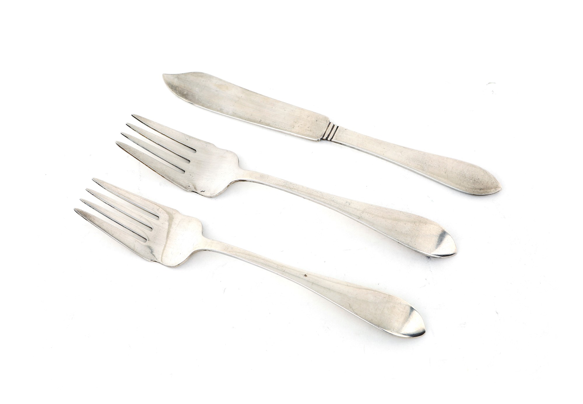 Tre posate da pesce in argento sterling, Cartier coltello e due forchette entro astuccio non originale, cm 19 e cm 20 - gr. 206 - astuccio cm 3x25x13