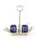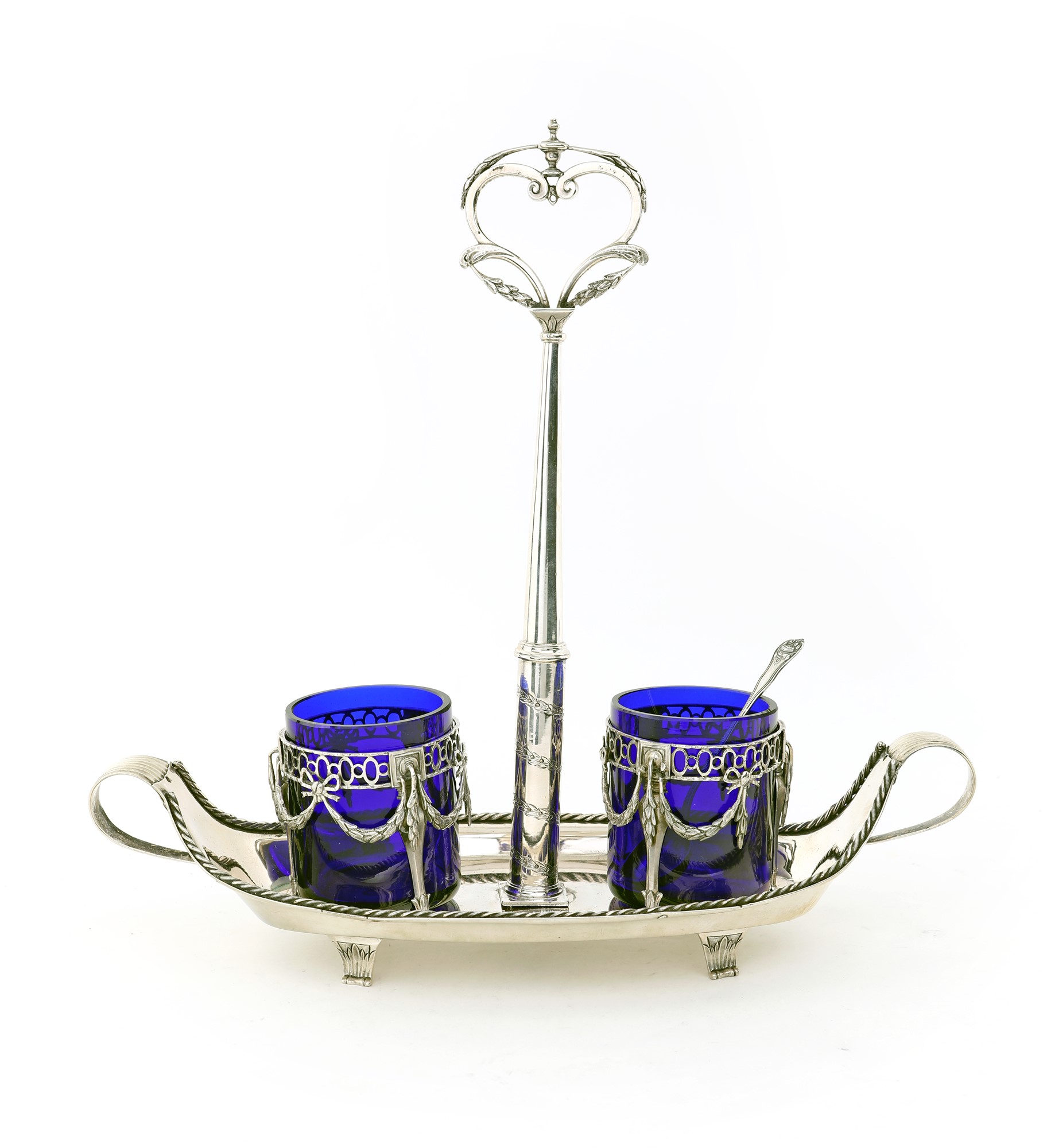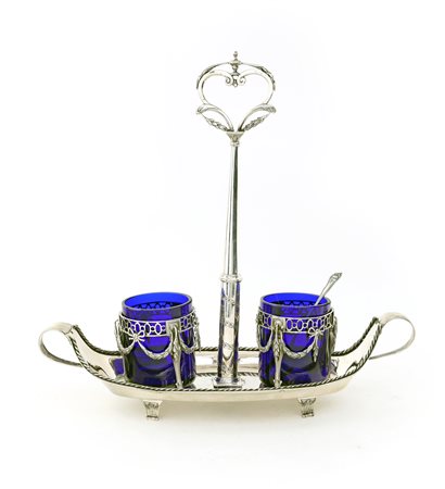 Porta salse in argento, Francia (?), XIX secolo con supporto a navicella su piedi a mensola, con profilo sottolineato da cordone, i cui vertici recano nastri incurvati a formare le anse; due contenitori cilindrici in vetro blu racchiusi da ringhierina abbellita da festoni sorretti da fiocchi, presa centrale con sommità a volute contrapposte. Il cucchiaio reca bolli francesi, 29x31x12,5 - gr. 528