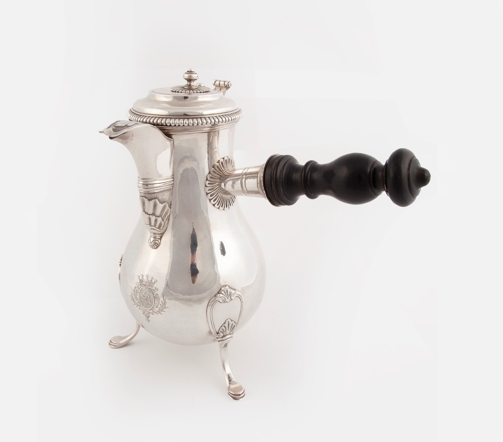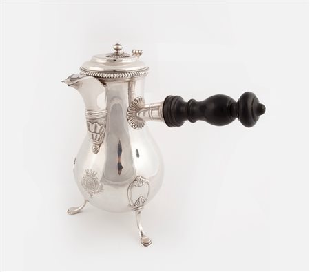 Cioccolatiera in argento, Francia, metà del XVIII secolo con corpo ad anfora ornato da stemma marchionale inciso, versatoio a becco, coperchio incernierato con caratteristico pinnacolo scorrevole a celare un foro per inserire un'asticciola per mescolare la cioccolata; tre sostegni arcuati terminanti a pied de biche, manico in legno, altezza cm 25,5 - gr. 1040