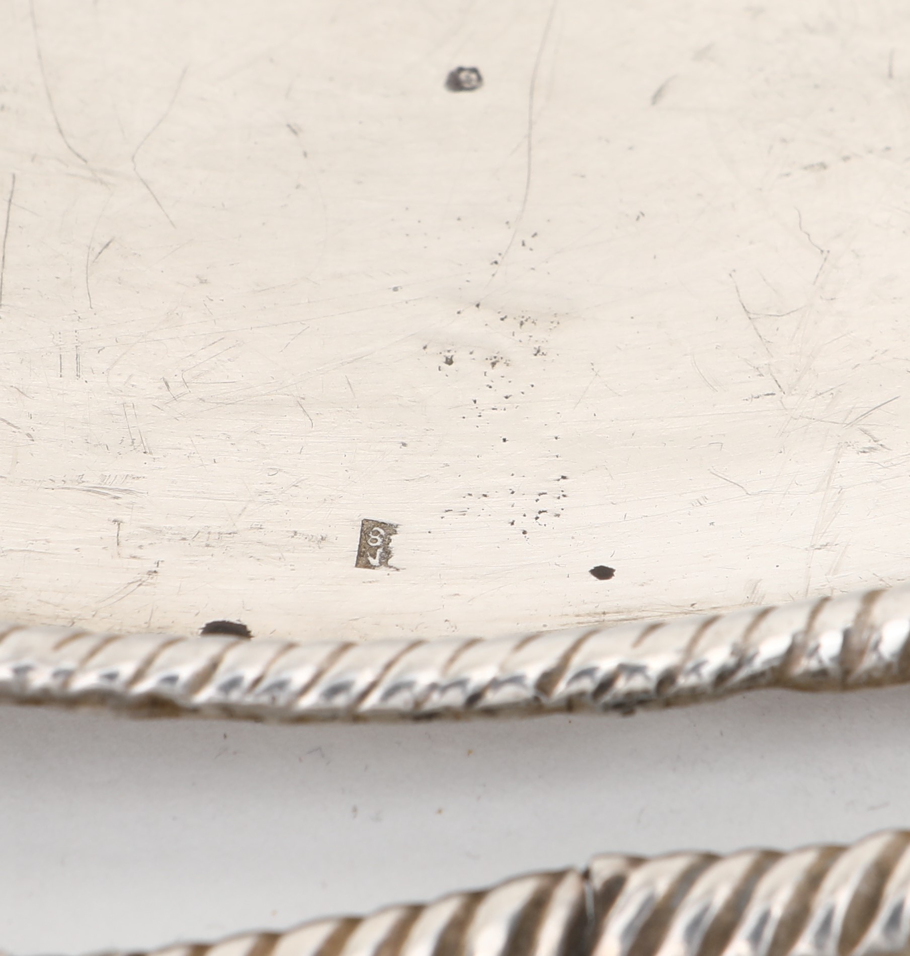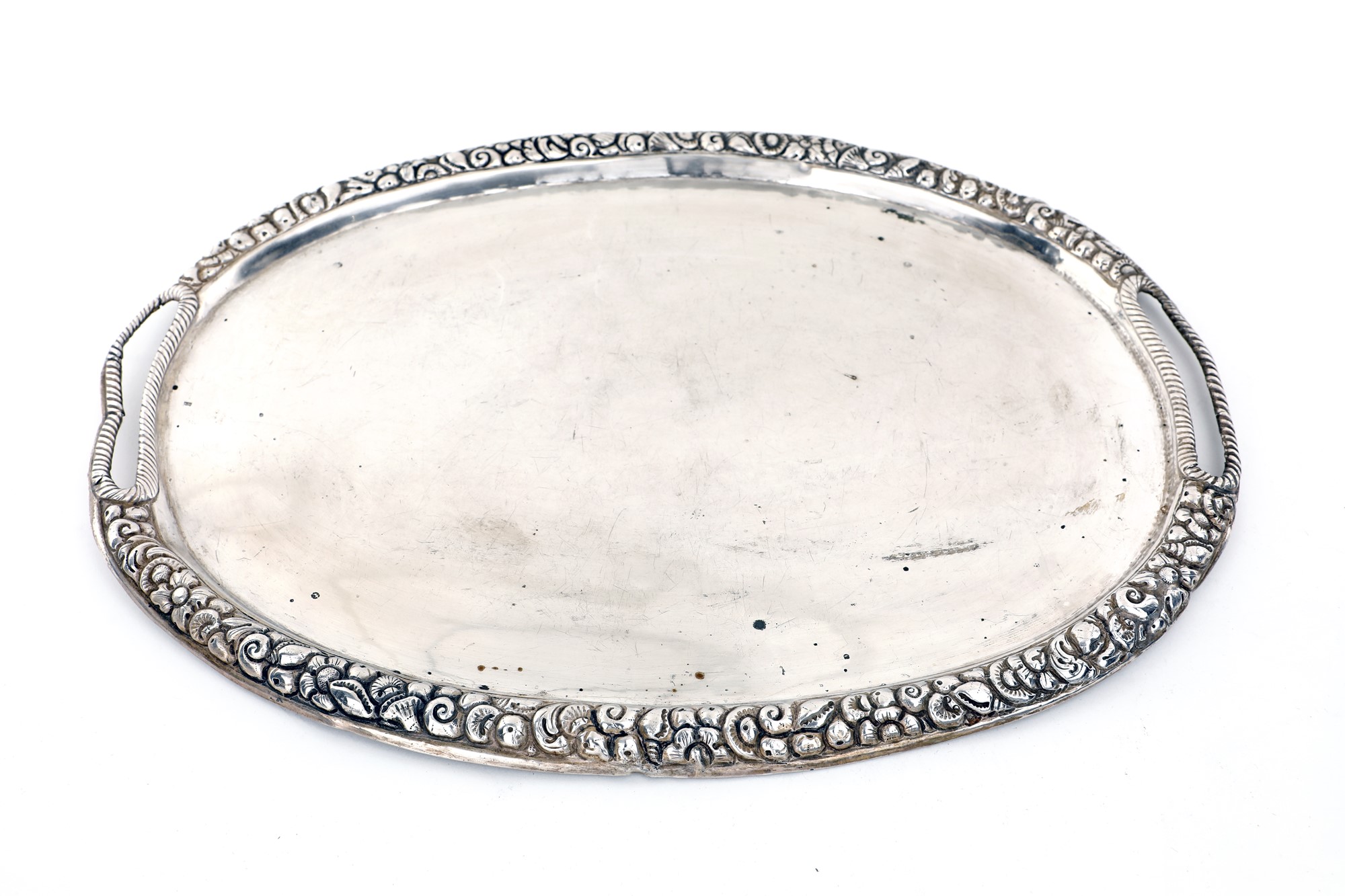 Vassoio ovale in argento, Napoli, metà del XIX secolo con profilo convesso con fitta decorazione sbalzata a "maruzzelle"; difetti, cm 33x24,5 - gr. 430