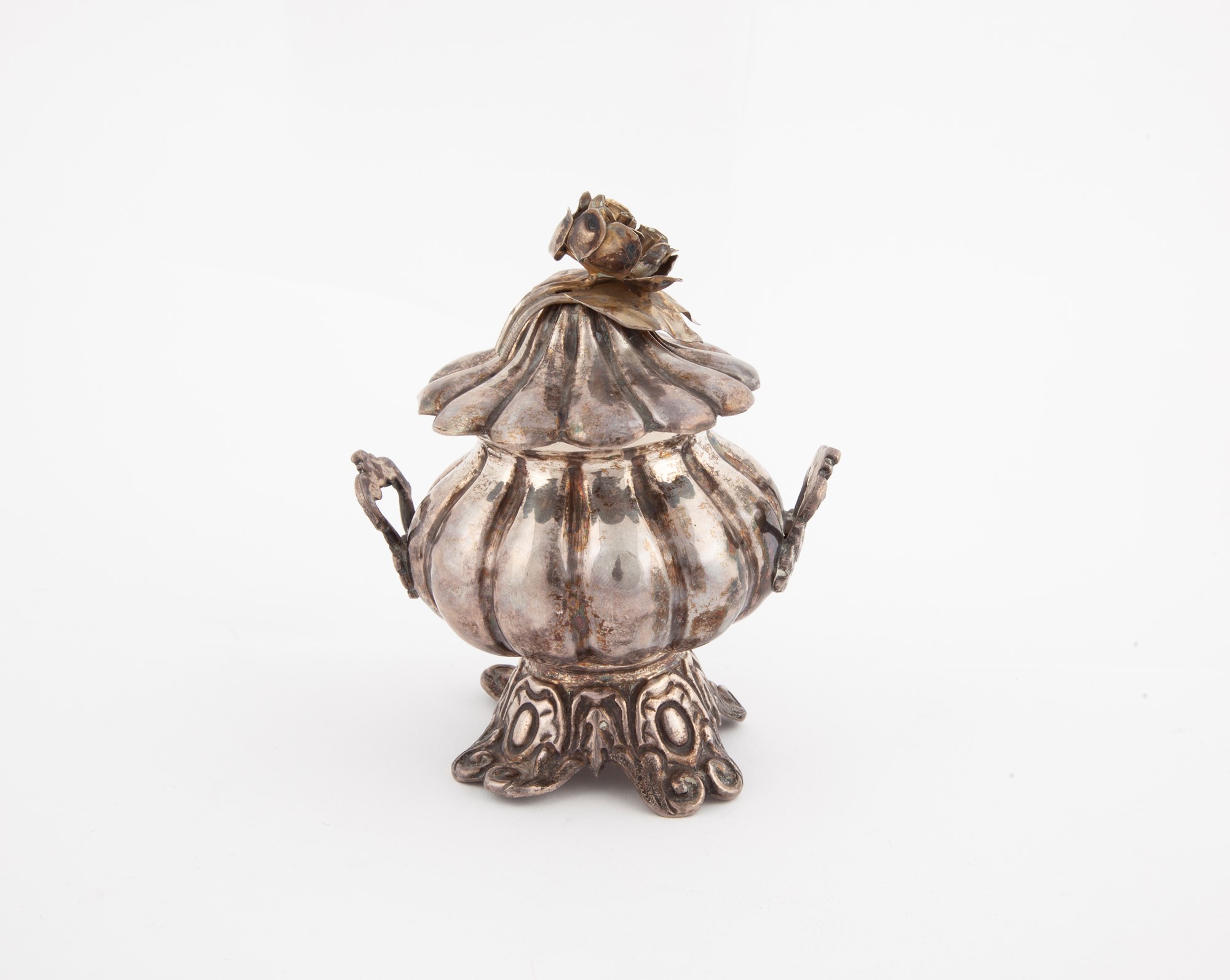 Piccola zuccheriera in argento con coperchio con corpo baccellato su base quadrilobata sbalzata in forma di cartigli; coperchio sormontato da un fiore, cm 12x9x6,5 - gr. 122
