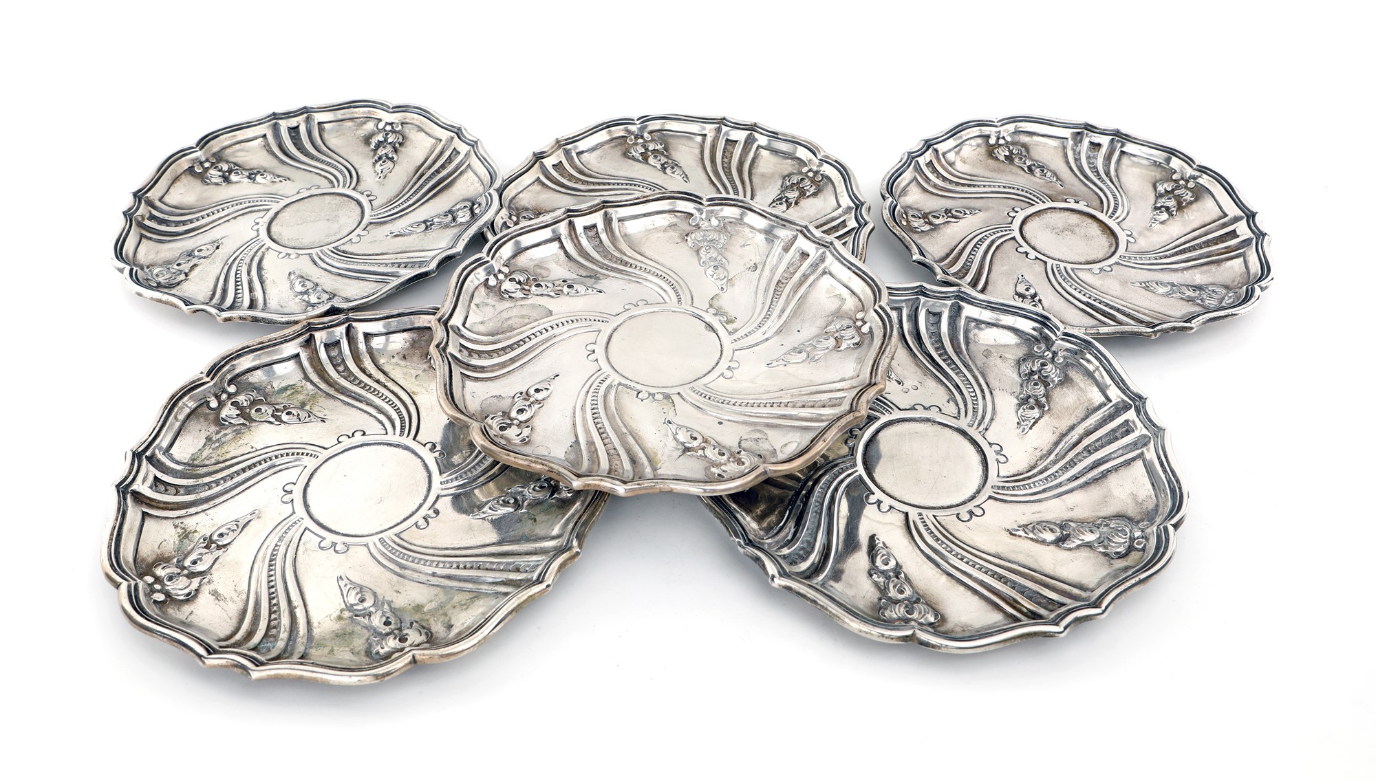 Sei piatti in argento, en suite con le coppette diametro cm 20 - gr. 1698