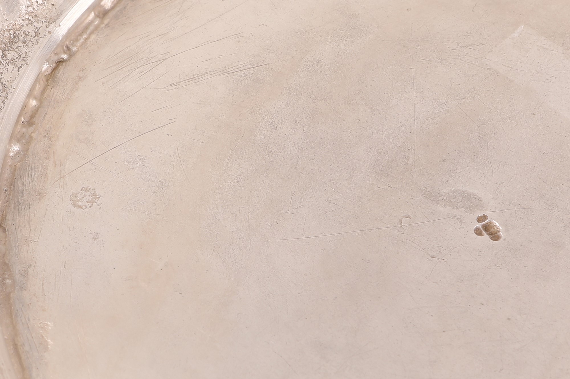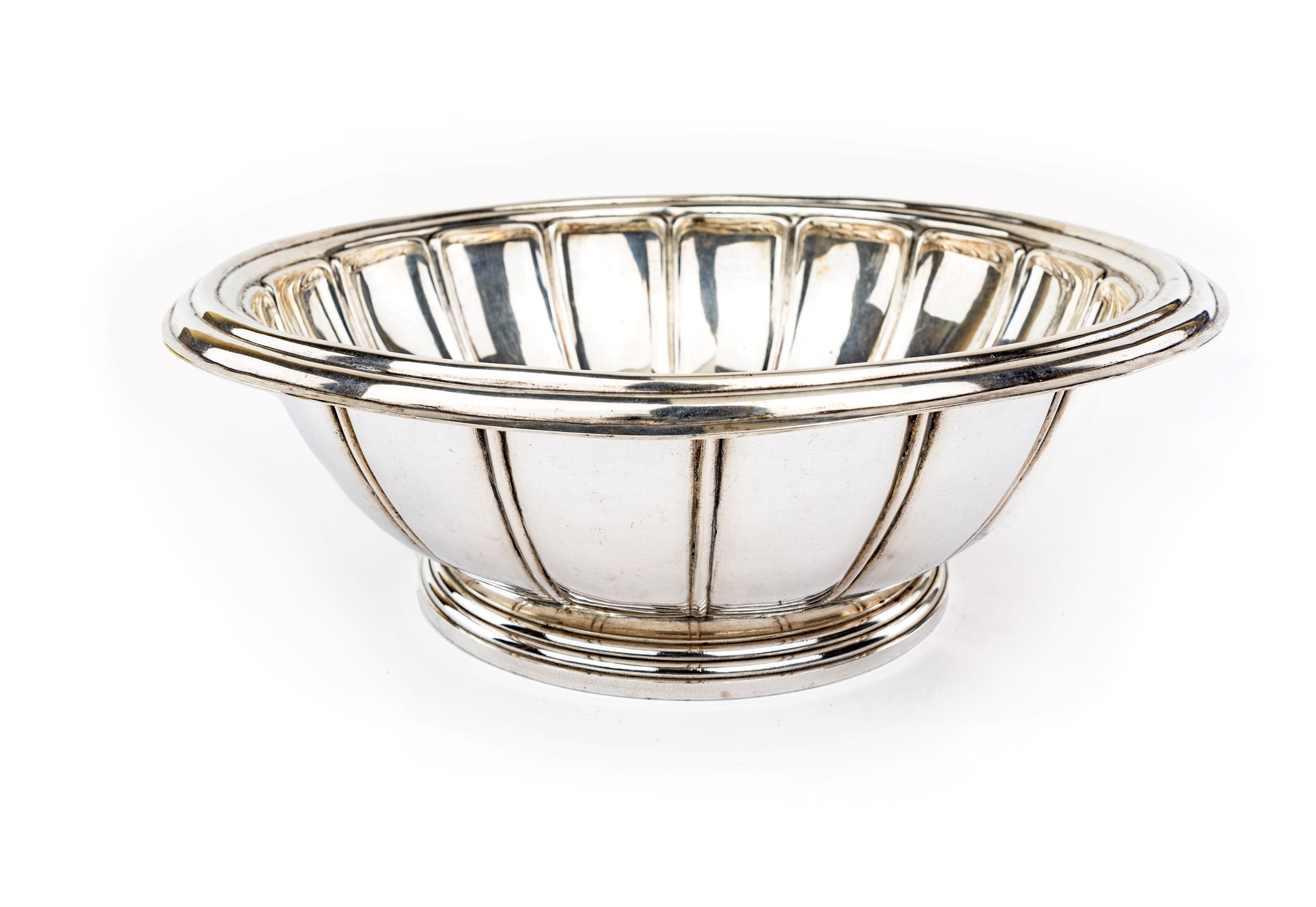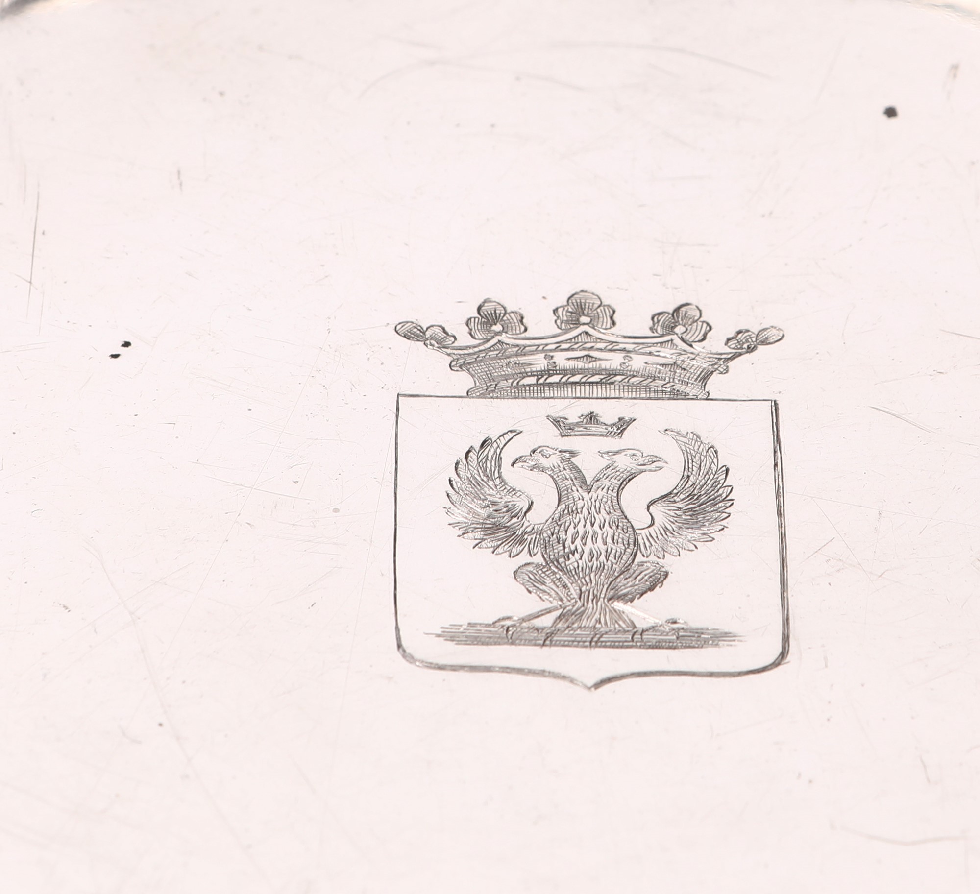 Bacile in argento, Napoli 1830/1840, argentiere F.R. di forma circolare con corpo suddiviso in riserve segnate da nervature ed orlo incurvato e modanato; al centro stemma marchionale con aquila bicipite inciso, basso piede gradinato, cm 12x37 - gr. 1888