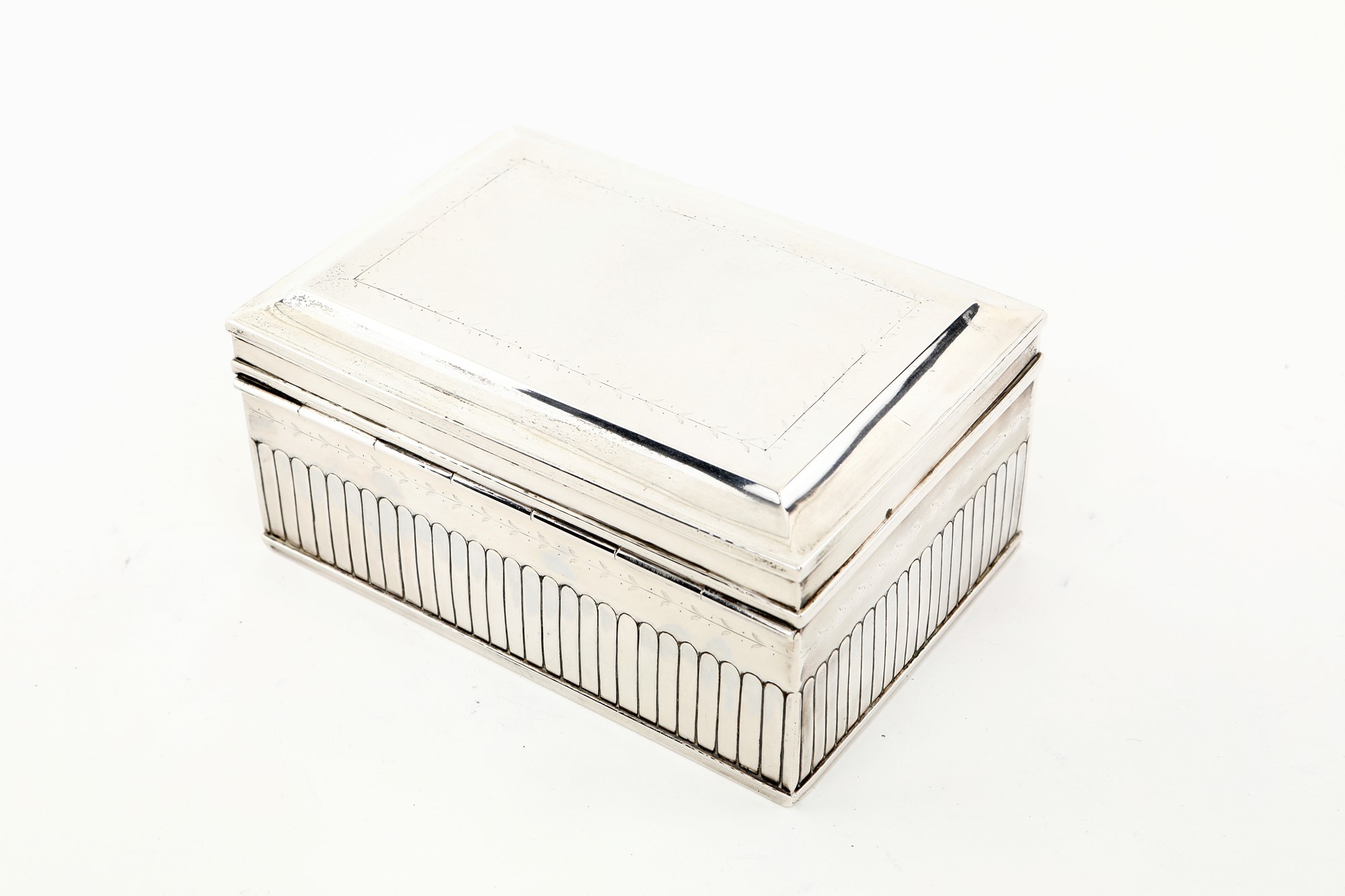 Scatola in argento, Leiden, Olanda, 1790, già collezione Sotirio Bulgari di forma rettangolare, decorata da listelli affiancati nella parte inferiore e da una sottile ghirlanda lineare incisa; coperchio incernierato con profilo ad incavo, cm 7,5x14,2x10 - gr. 458