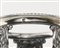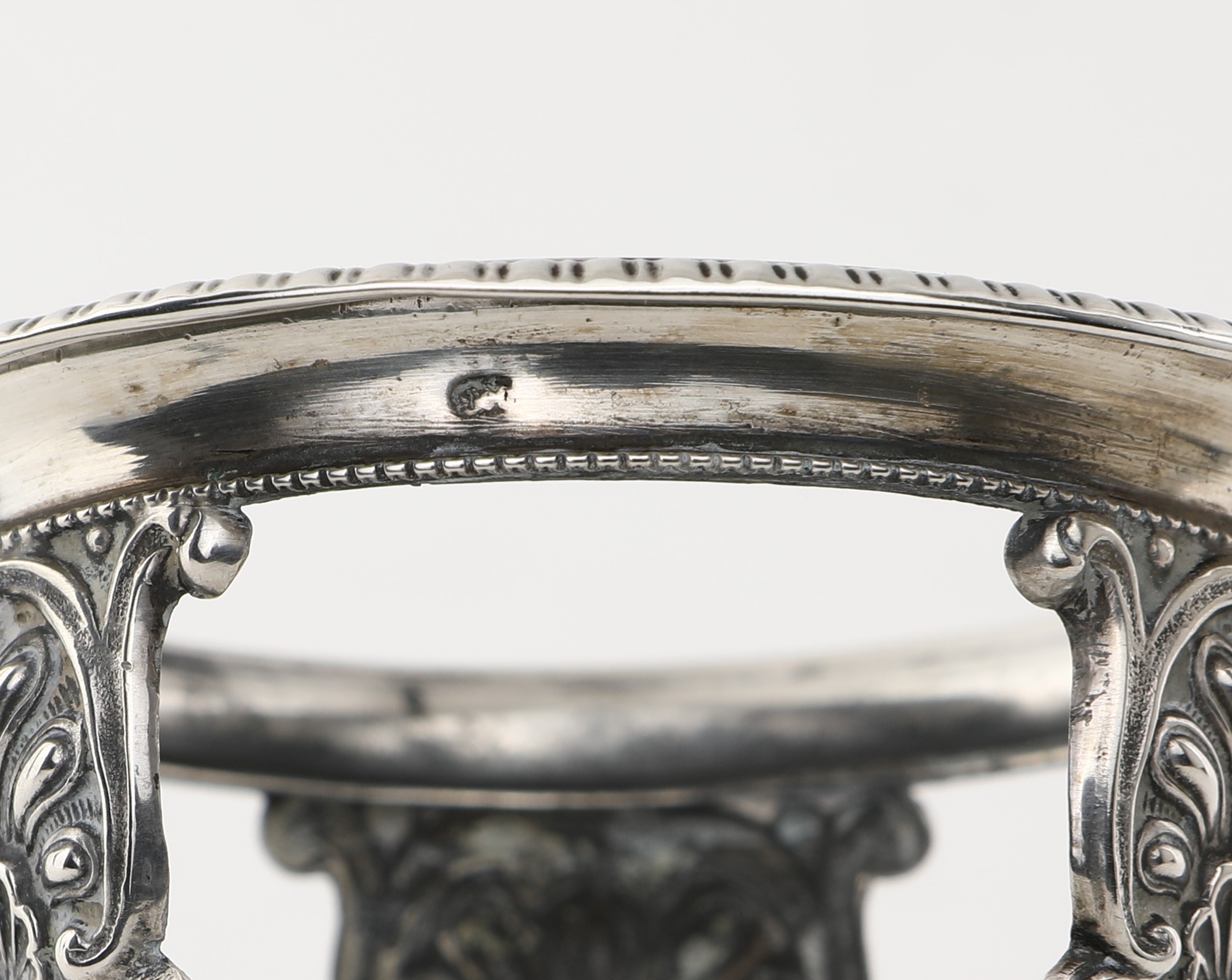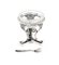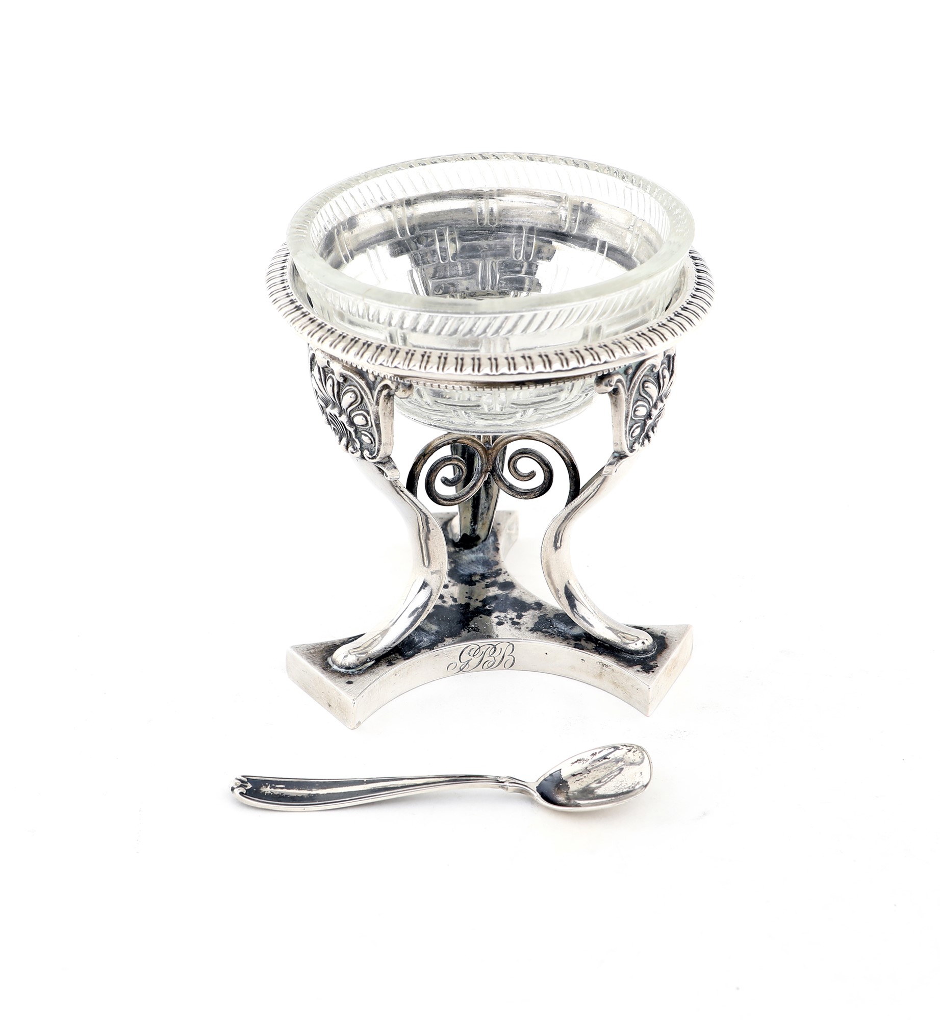 Saliera in argento, nord Europa (?) con vaschetta circolare in vetro racchiusa da telaio sostenuto da tre elementi sagomati decorati all'attaccatura da valve sbalzate e cesellate, riuniti da traverse a ricciolo e poggianti su base trilobata. Cucchiaino non pertinente, cm 8x7,5 - gr. 94
