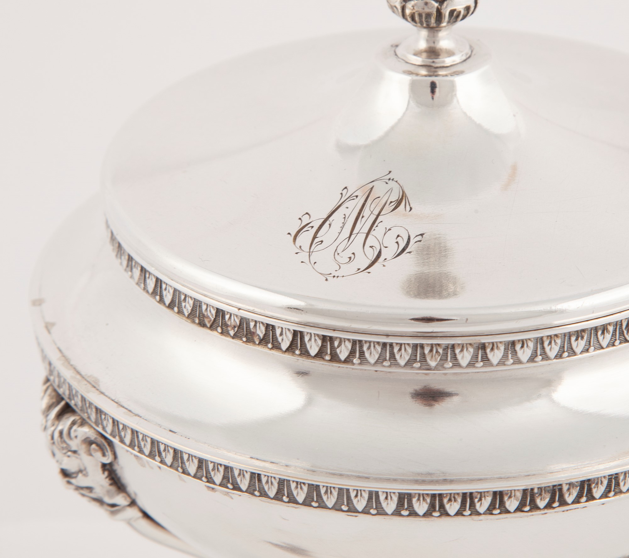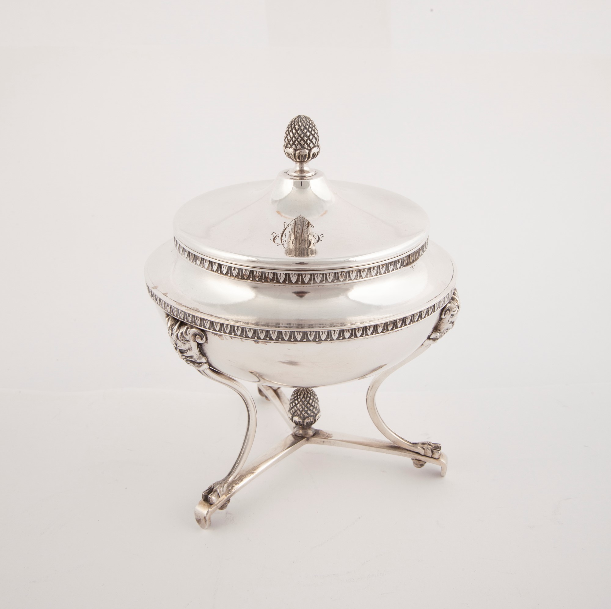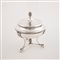 Zuccheriera in argento con coperchio, austro-ungarico, 1830 - 1840, argentiere F.P. monogramma CM in corsivo sul coperchio, sostegno tripode, cm 16,5x13 - gr. 475
