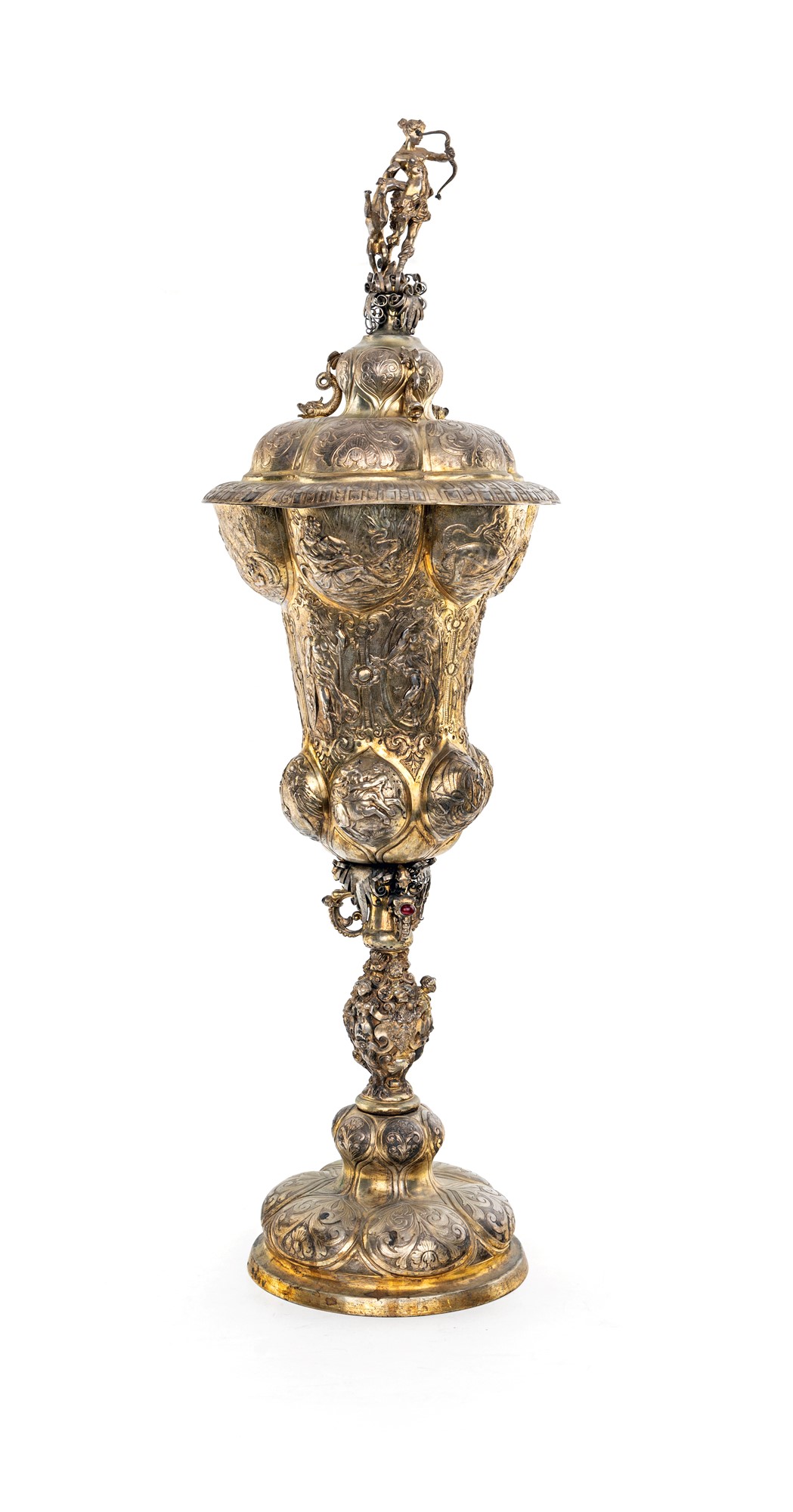 Grande coppa con coperchio in argento fuso, sbalzato e cesellato, bolli austro ungarici a forma di calice ispirato ai modelli prodotti in Europa centrale fra il XVI e il XVII secolo, con sei figure mitologiche desunte dal repertorio classico disposte intorno alla circonferenza, cui corrispondono della parte inferiore sei formelle circolari bombate con rappresentazioni mitologiche ed altrettante nicchie convesse lungo l'orlo superiore decorate da divinità fluviali. Sostegno a balaustro con figure di cariatide e mascheroni impreziosito all'attaccatura della coppa da fregi zoomorfi guarniti da gemme cabochon rosso rubino. Piede circolare con decorazione naturalistica incisa. Sulla sommità del coperchio, guarnito da riccioli, figura di Diana cacciatrice con arco affiancata da cane levriero, altezza cm 67 - gr. 2288