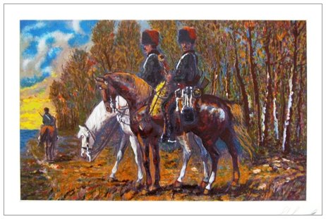 GIOVANFRANCESCO GONZAGA Milano 1921 - Milano 2007 Senza titolo (cavalli) Serigrafia polimaterica a colori es.P.A. Firma + timbro a secco “Istituto Italiano” in b. a d. (34,8 x 50 foglio – 25 x 40 ser.)